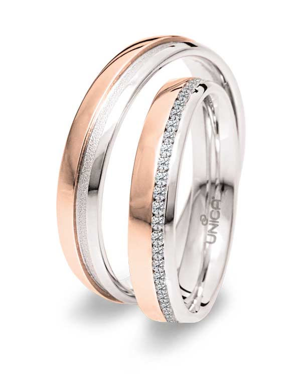Anelli nuziali preziosi e molto raffinati, dalla forma leggermente bombata con interno comfort. Caratteristica peculiare � lo scavo quadro sabbiato disposto in posizione decentrata che accoglie i diamanti con incassatura a binario. Fedi che fanno sognare.