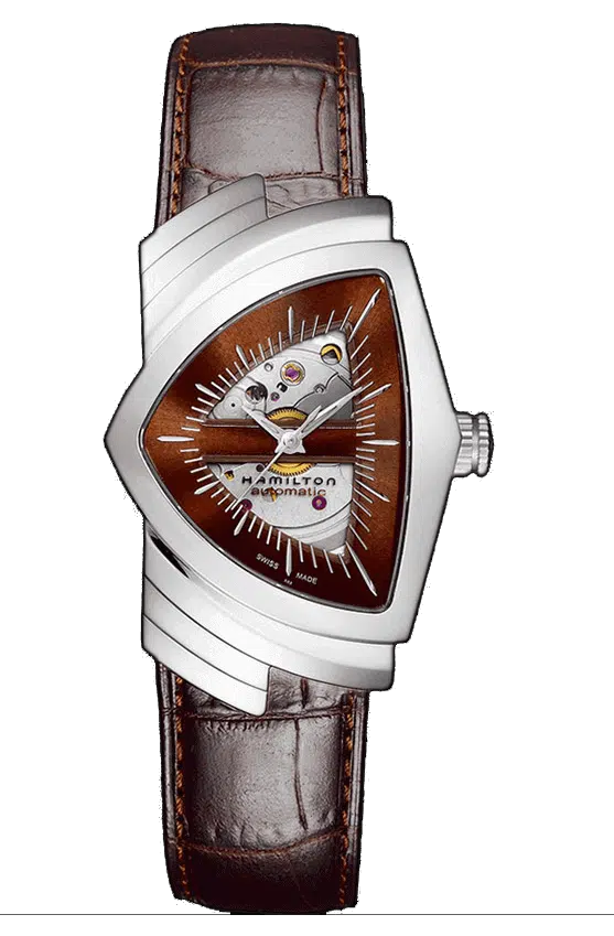 Il Ventura è un fedele omaggio al modello originale del 1957, che passò alla storia dell’orologeria come il primo orologio elettrico a batteria al mondo. I dettagli della cassa del nuovo modello rispecchiano quelli dei suoi antenati, insieme alla caratteristica forma a scudo. Questa versione automatica presenta aperture sul quadrante che rivelano il movimento in azione