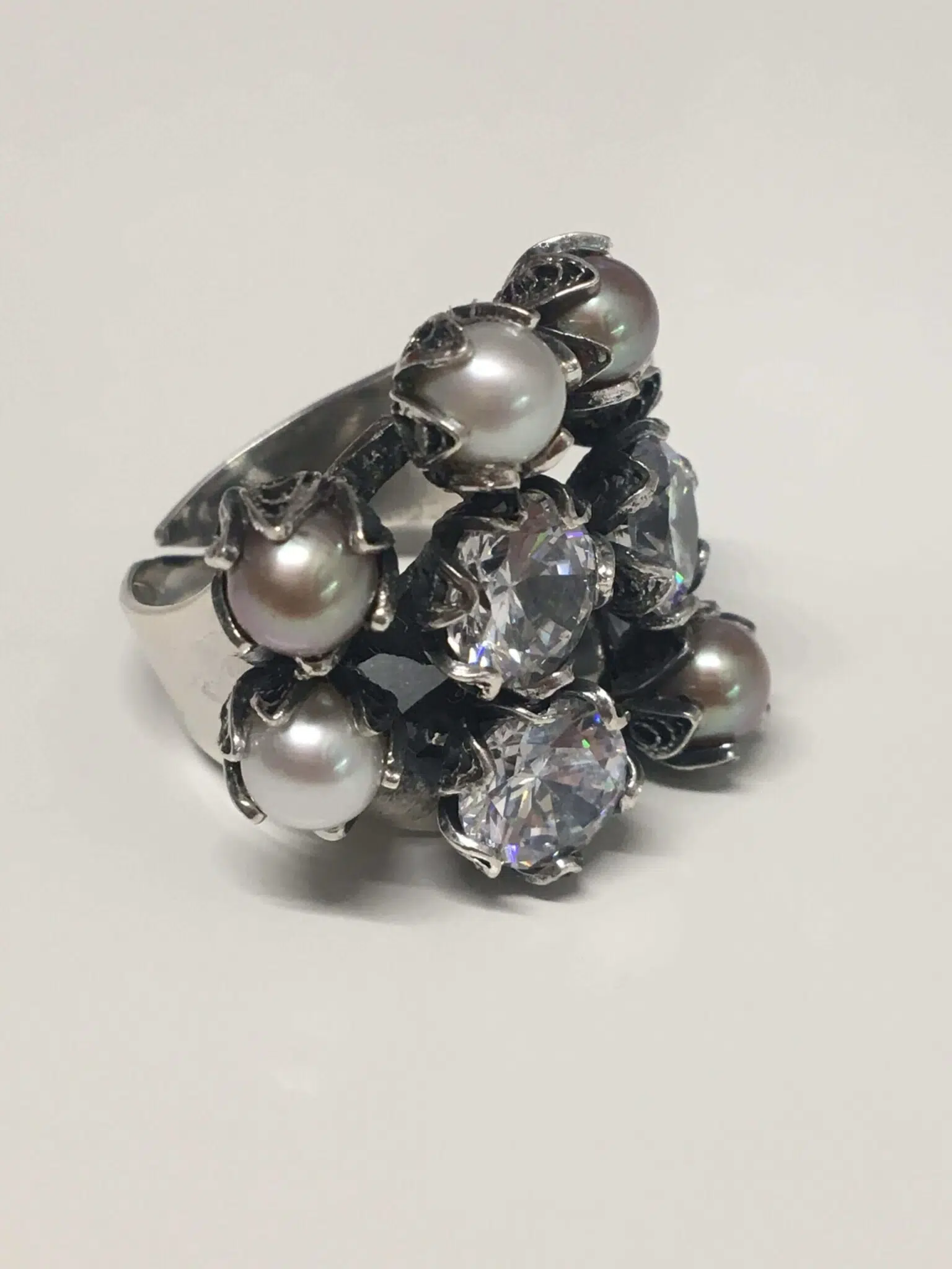 Anello in argento 925,con ortensie che accolgono perle e zirconi formando un bouchet. Un mazzo di fiori Yvone Chrisa direttamente da New York.