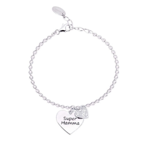 Bracciale in argento 925/1000 con 2 pendenti a cuore, uno in solo argento, l'altro in argento e zirconi………SUPERMAMMA!!!!