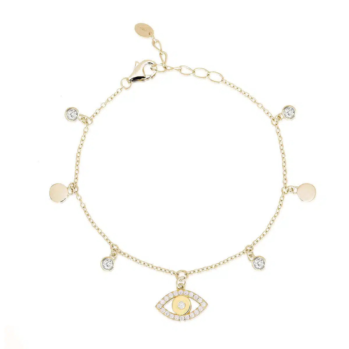 Bracciale in argento 925/1000 Dorato con zirconi. Pendente centrale a forma di occhio con zirconi.