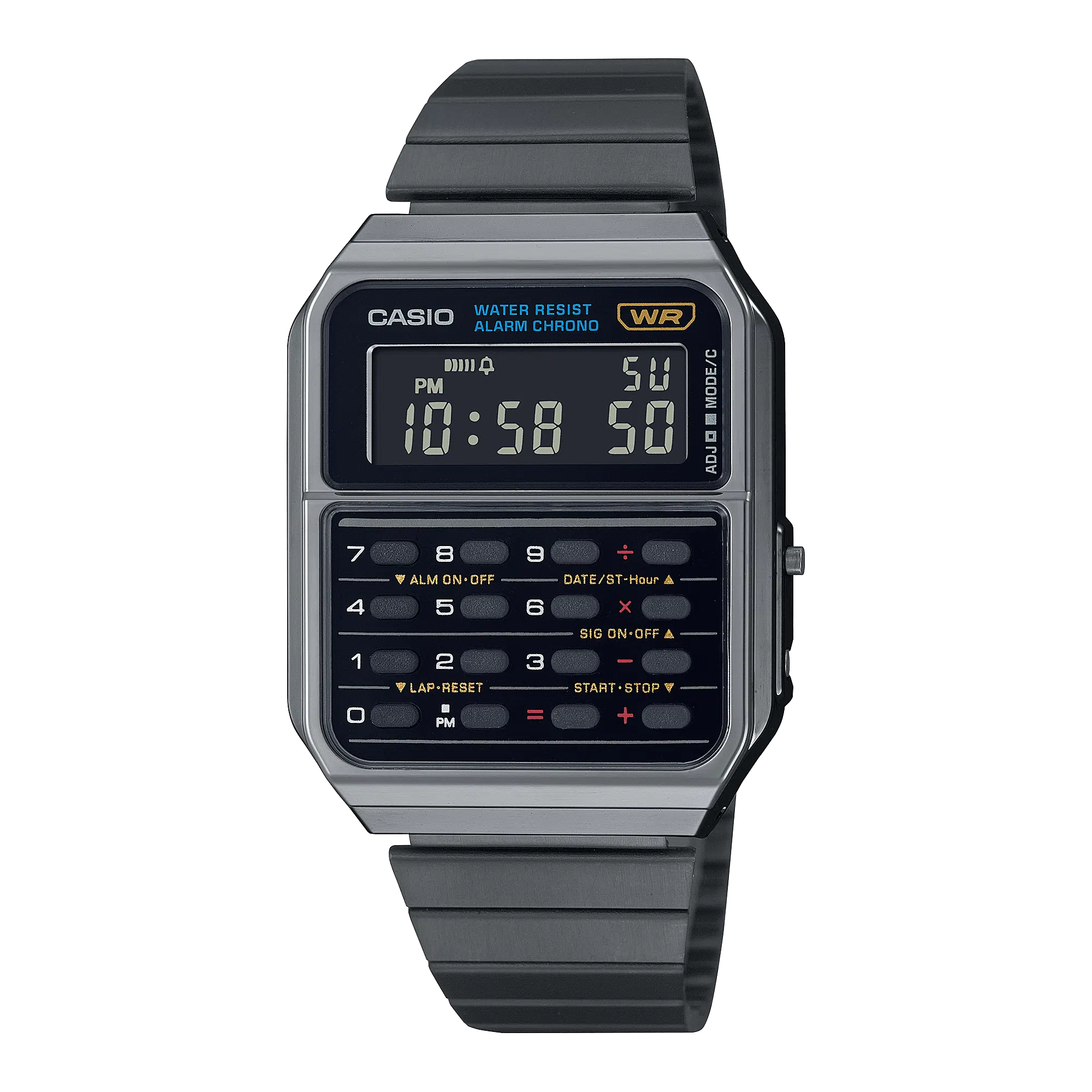 Il modello dotato di calcolatrice Casio, uno dei preferiti dagli anni ’80, rinnova il suo look con un effetto metallizzato di alta qualità. Le stesse funzioni originali della fantastica calcolatrice si abbinano a una cassa allungata e a un cinturino in metallo per un look completamente retrò.