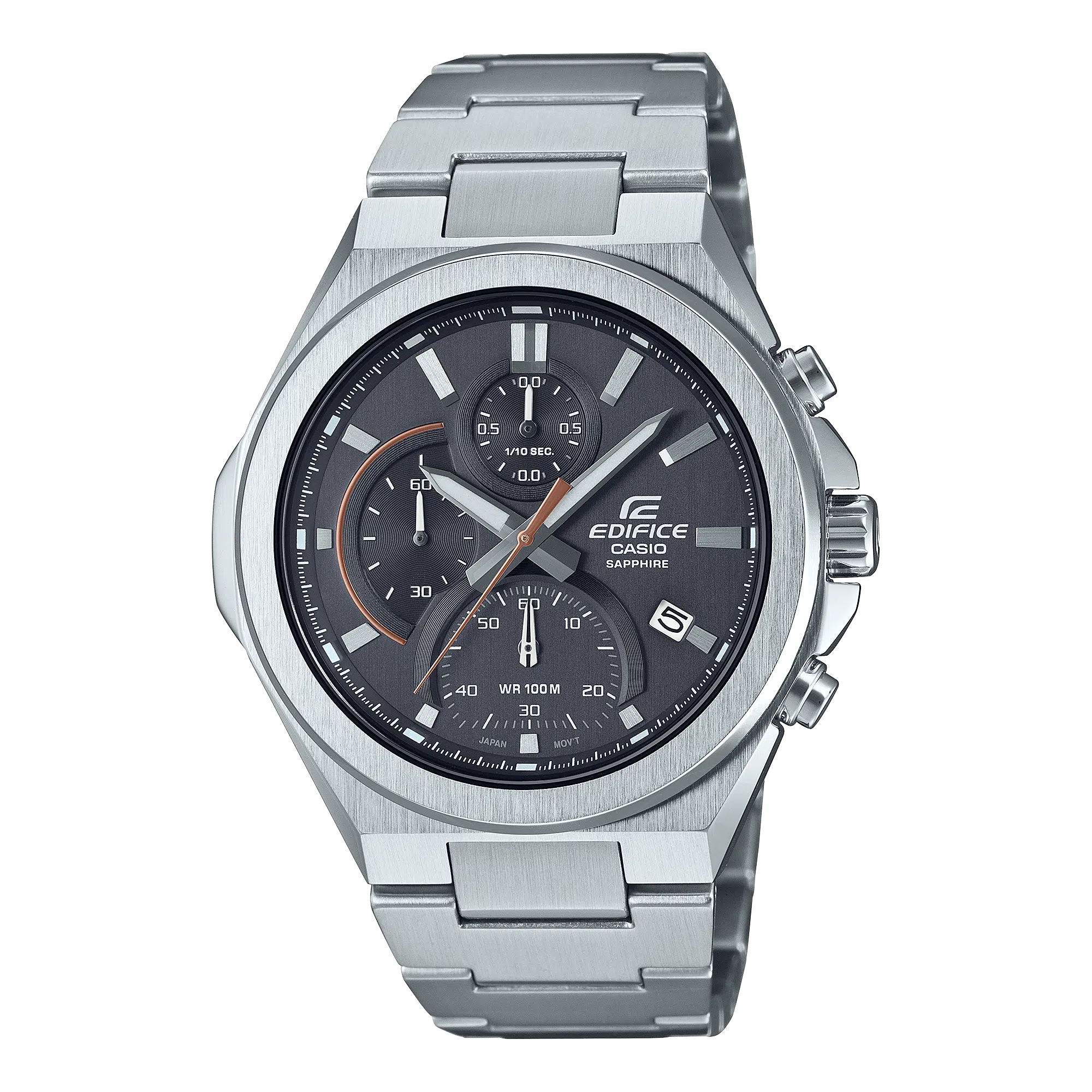 L’EFB-700D è l’ultimo cronografo sportivo della linea Edifice. Caratterizzato da un semplice design sportivo e da un vetro zaffiro antigraffio, questo segnatempo interamente in acciaio inossidabile è impermeabile fino a 100 metri ed è dotato di un cronometro 1/10 e di una batteria di 3 anni.