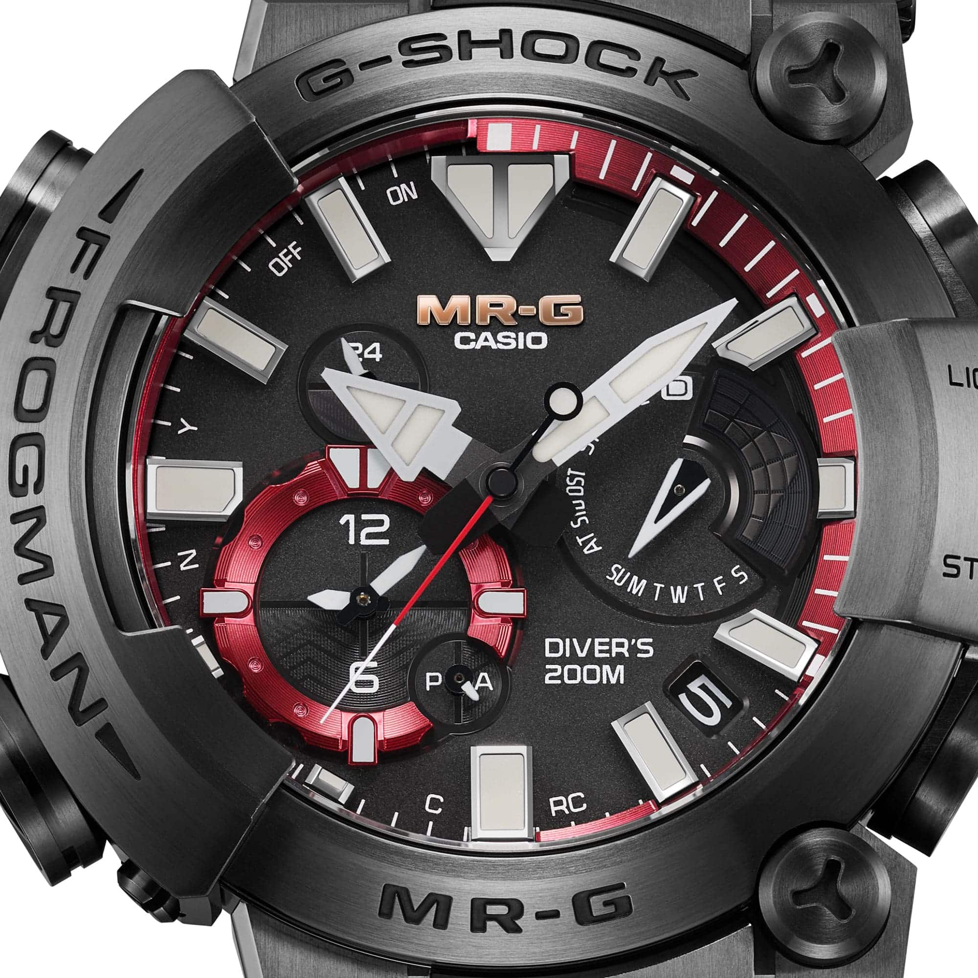 Prodotto originariamente in resina, questo segnatempo è stato rifatto in titanio, con ogni componente lavorato meticolosamente per un aspetto di alta qualità e completamente nuovo. L’orologio è costruito con una combinazione complessa di oltre 70 componenti esterni, tra cui un O-ring impermeabile che garantisce l’eccezionale resistenza all’acqua FROGMAN e speciali tamponi che rafforzano la struttura resistente agli urti, il tutto mantenendo la bellezza della forma per cui è nota la linea MR-G.