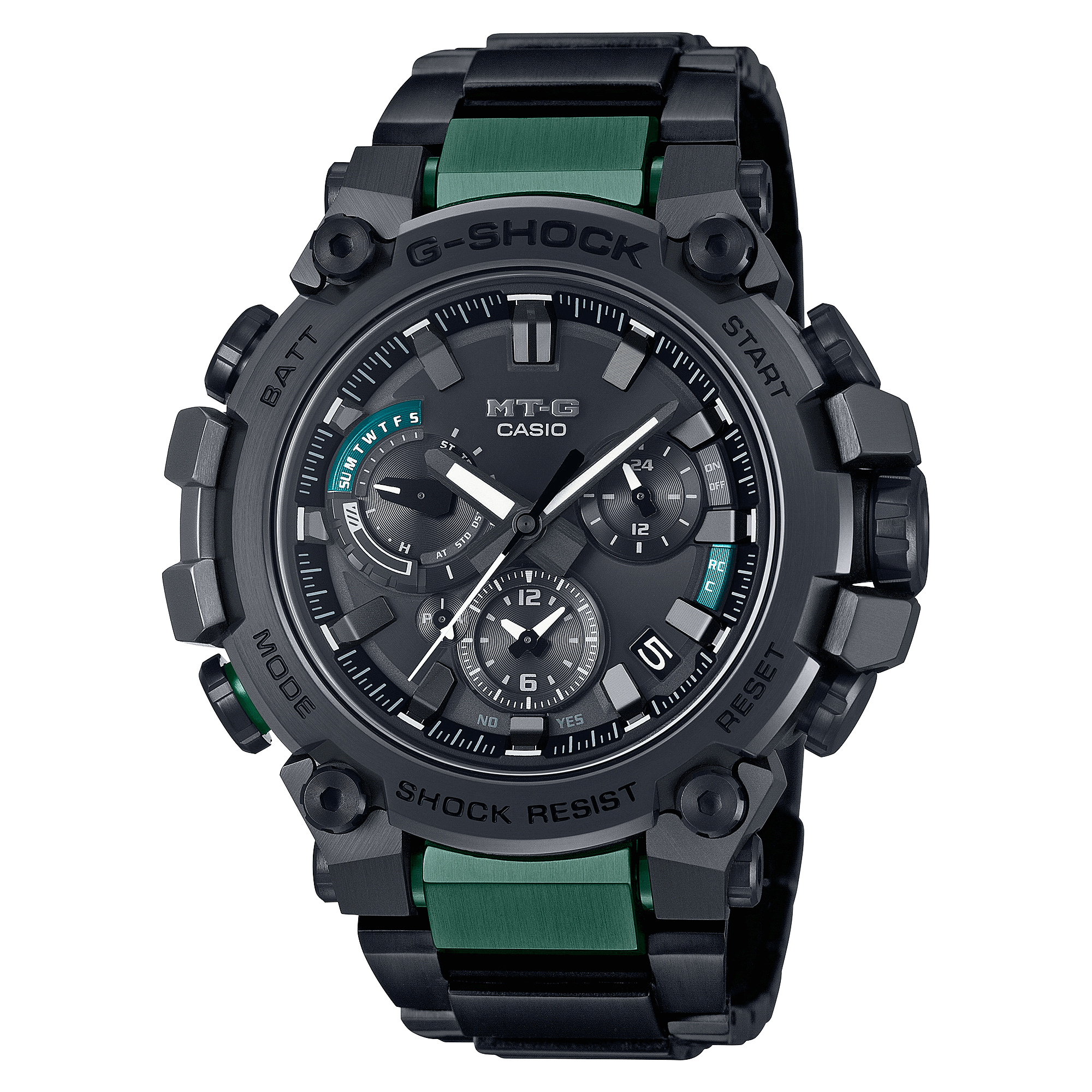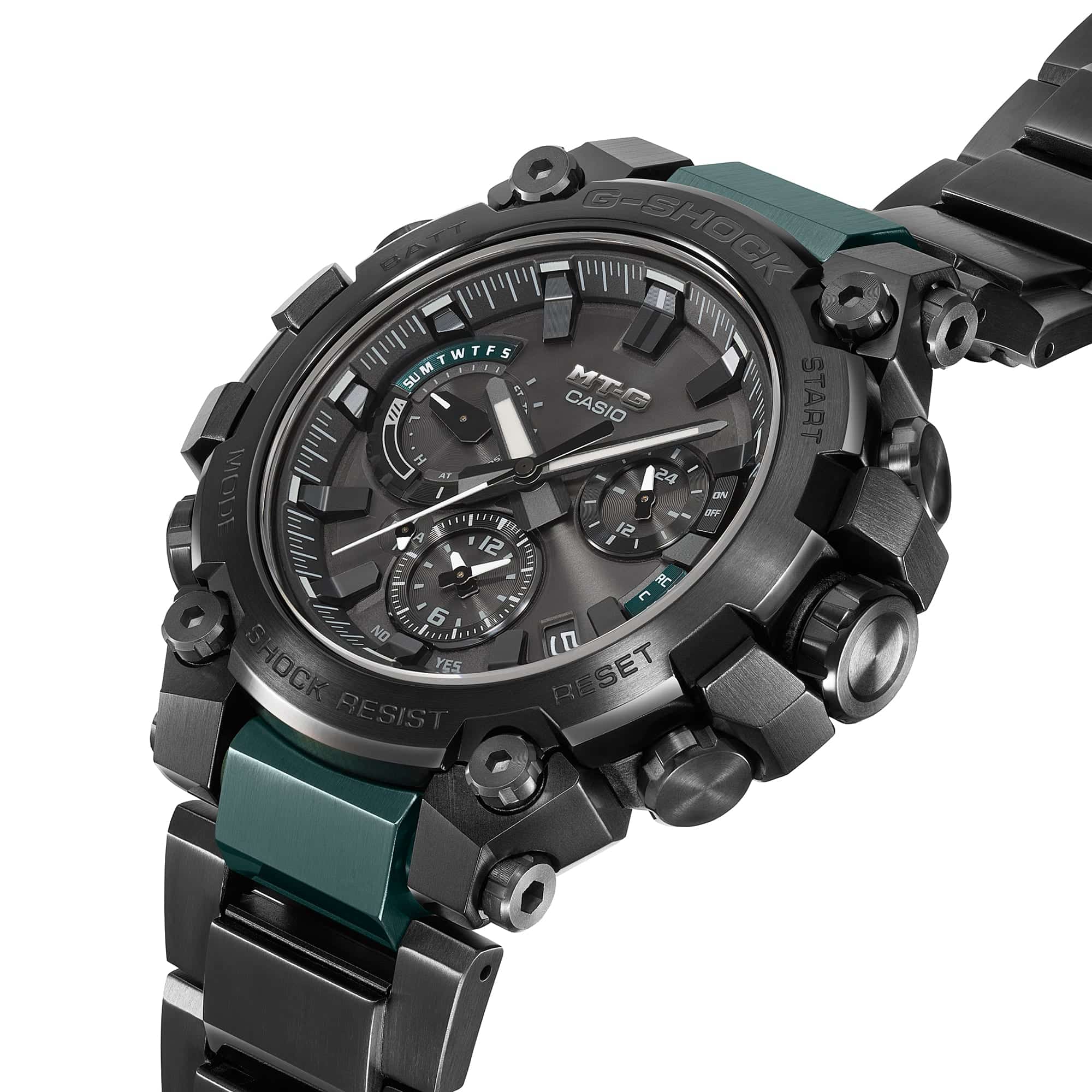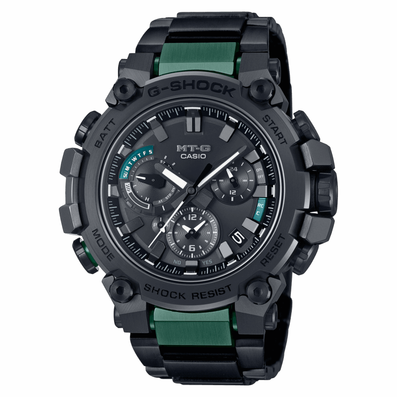 Scopri una forma innovativa di grande bellezza strutturale, un orologio MT-G nato da un concetto di design completamente nuovo che combina la resina utilizzata nei primi modelli G-SHOCK con materiali metallici. Benvenuti a un livello completamente nuovo di sofisticato design strutturale. Grazie alla sua struttura di protezione a doppio nucleo ancora più avanzata, il modello MTG-B3000 protegge il modulo in una cassa in resina rinforzata con carbonio e racchiude l’esterno in componenti metallici. La pressatura, il taglio e la lucidatura ripetuti ricostruiscono la cassa in acciaio inossidabile verso l’alto in un’intricata forma in 3D. La parte posteriore della cassa serve, come alette, per fissare il cinturino e per proteggere corona e pulsanti, per una struttura completamente nuova. Utilizzando la tecnologia di montaggio ad alta densità, abbiamo sviluppato un nuovo modulo multifunzione più sottile. Tutti questi design e tecnologie innovativi hanno creato un orologio molto più sottile, con una misura di soli 12,1 mm dalla cornice alla parte posteriore della cassa. L’innovazione MT-G si estende anche al cinturino. La nuova struttura di sostituzione one-touch elimina la necessità di attrezzi speciali. Il vetro zaffiro ad alta trasparenza abbinato alla delicata modellatura e deposizione a vapore della nanotecnologia Yamagata Casio aggiunge un tocco finale di raffinatezza e qualità. Il modello MTG-B3000BD è dotato di cinturino composito stratificato in segmenti cavi in acciaio inossidabile che racchiude parti in resina fine per una maggiore leggerezza. I componenti in metallo a placcatura ionica donano un tocco di colore fresco all’elegante design nero. Questo nuovo stile innovativo e resistente offre funzionalità complete. Scarica l’app CASIO WATCHES da abbinare allo smartphone tramite Bluetooth®. Grazie al Multi Band 6, al sistema di alimentazione Tough Solar e alla luce LED ad alta luminosità, questo orologio garantisce prestazioni ottimali, qualunque siano le tue avventure.