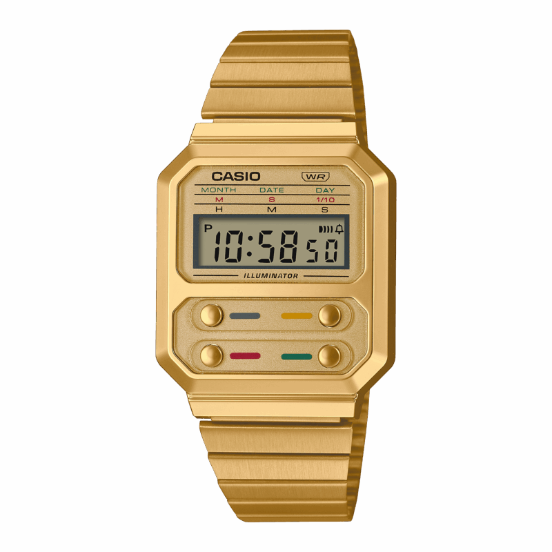A.P.C. ha collaborato con Casio per creare un orologio che unisce i dettagli del marchio francese con l’iconico modello A1000. Orologio unisex dalle molteplici funzioni (sveglia, cronometro, retroilluminazione a LED), il suo quadrante elegante e le sue linee vintage sono come una macchina del tempo: un’estetica d’epoca che richiama gli anni Settanta. Questo modello presenta un profilo sottile, una cassa ottagonale e uno schermo LCD al centro del quadrante che visualizza chiaramente l’ora. A.P.C. e Casio propongono una versione particolarmente sottile di questa collaborazione in due versioni – argento e oro – che offrono entrambe un elegante gioco visivo tra l’effetto specchio del quadrante e la lucentezza opaca del bracciale in acciaio facilmente regolabile. Per un minimalismo ancora maggiore, gli indicatori di modalità per ciascun pulsante sono incisi sul fondello, insieme al caratteristico logo A.P.C. guitar dagger.