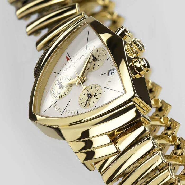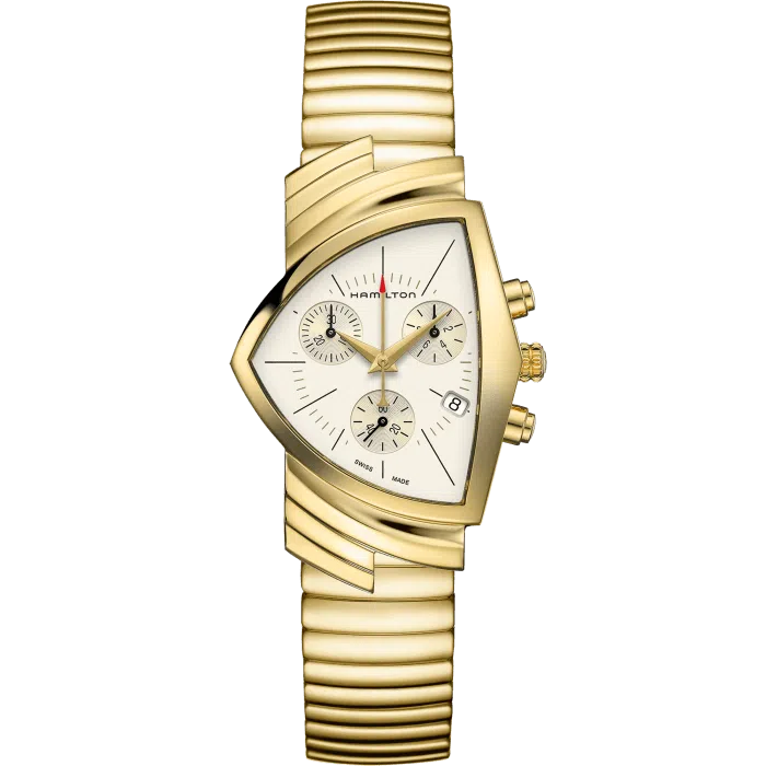 Il Ventura originale, presentato nel 1957, passò alla storia dell’orologeria come il primo orologio elettrico a batteria al mondo. Con il suo design unico e audace, divenne rapidamente un’icona e un oggetto da collezione. L’ultima interpretazione del Ventura è un fedele tributo all’originale e richiama la pionieristica forma a scudo della cassa, esempio di design moderno ”Mid-Century”, adattata a un cronografo sportivo.