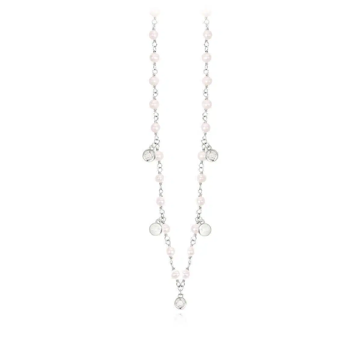 Collana in argento 925/1000 con perle coltivate 3,5 mm e zirconi. Lavorazione a rosario e lunghezza regolabile fino a 45 cm. Zirconi e piattine argento pendenti.