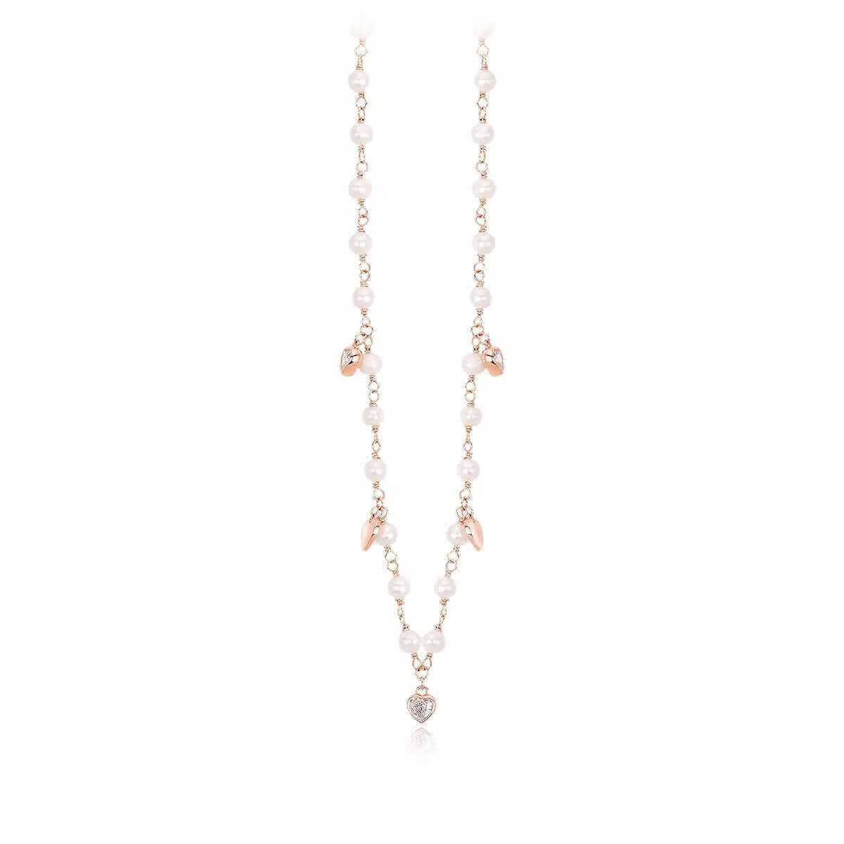 Collana in argento 925/1000 Rosato con perle coltivate 3/3,5 mm, zirconi e cuori. Lavorazione a rosario, lunghezza cm. 45.