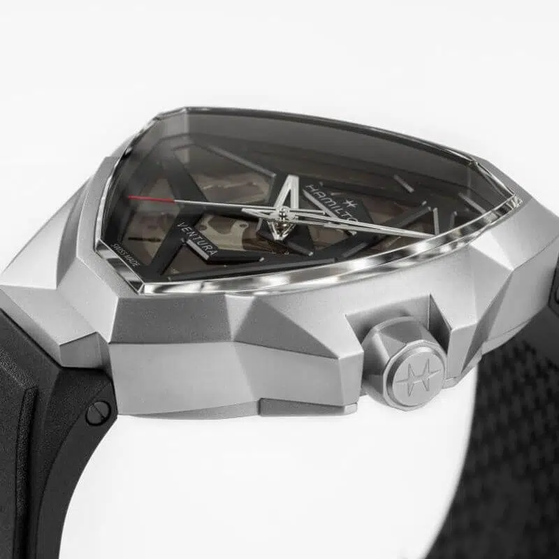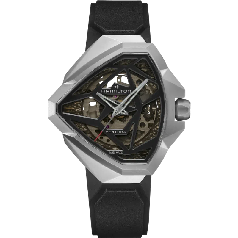 Sfidando le convenzioni, il Ventura Edge Skeleton fa un audace passo nel futuro dell’orologeria. Distaccandosi dall’iconica struttura triangolare della cassa del Ventura, presenta un nuovo e audace design architettonico. Scuro, enigmatico e dal design straordinario, questo segnatempo gioca con luci e ombre ed è incorniciato da una cassa in acciaio argentato a contrasto per un effetto ancora più spettacolare. Il suo fulcro è il movimento H-10-S, che si rivela progressivamente grazie a un quadrante scheletrato dall’effetto sfumato. Questo segnatempo è corredato da un cinturino in caucciù nero.