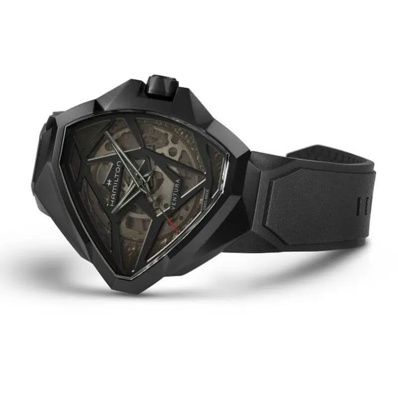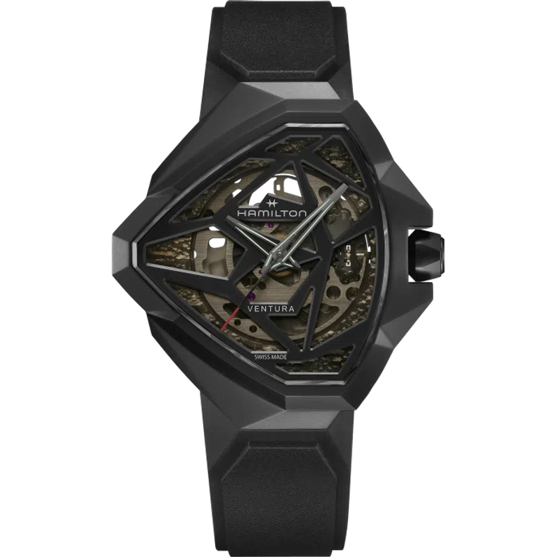 Sfidando le convenzioni, il Ventura Edge Skeleton fa un audace passo nel futuro dell’orologeria. Distaccandosi dall’iconica struttura triangolare della cassa del Ventura, presenta un nuovo e audace design architettonico. Scuro, enigmatico e dal design radicale, questo segnatempo gioca con luci e ombre, aggiungendo una profondità quasi ultraterrena alla sua forma. Al suo interno si trova il movimento H-10-S, incorniciato da una cassa nera e rivelato progressivamente dall’effetto sfumato scheletrato del quadrante. Questo segnatempo è corredato da un cinturino in caucciù nero.