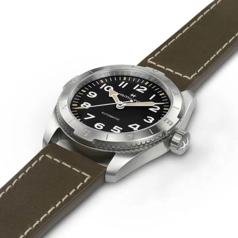 Preparati per un’avventura all’aria aperta con il Khaki Field Expedition, un orologio ideale per tutte le attività outdoor con un design a bussola, che ti permetterà, durante le escursioni, di orientarti con l’aiuto del sole. Racchiuso in una cassa in acciaio da 37 mm corredata da un cinturino in pelle verde, questo orologio è dotato di corona a vite per proteggere il movimento in qualunque condizione atmosferica. Dotato di un quadrante nero testurizzato con rivestimento in Super-LumiNova® per una leggibilità eccezionale, il Khaki Field Expedition possiede tutta la robustezza di cui hai bisogno.