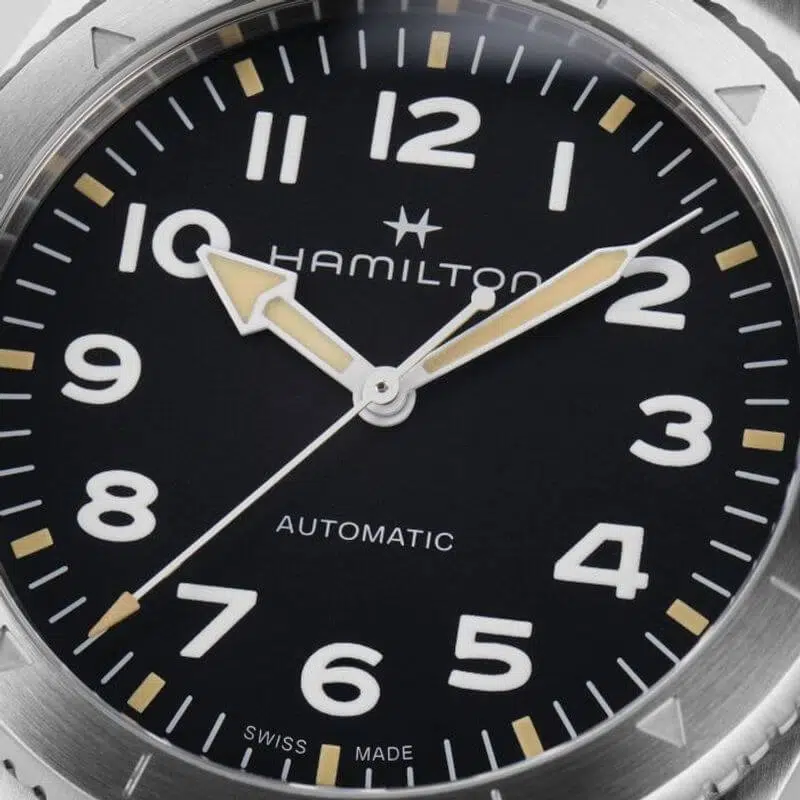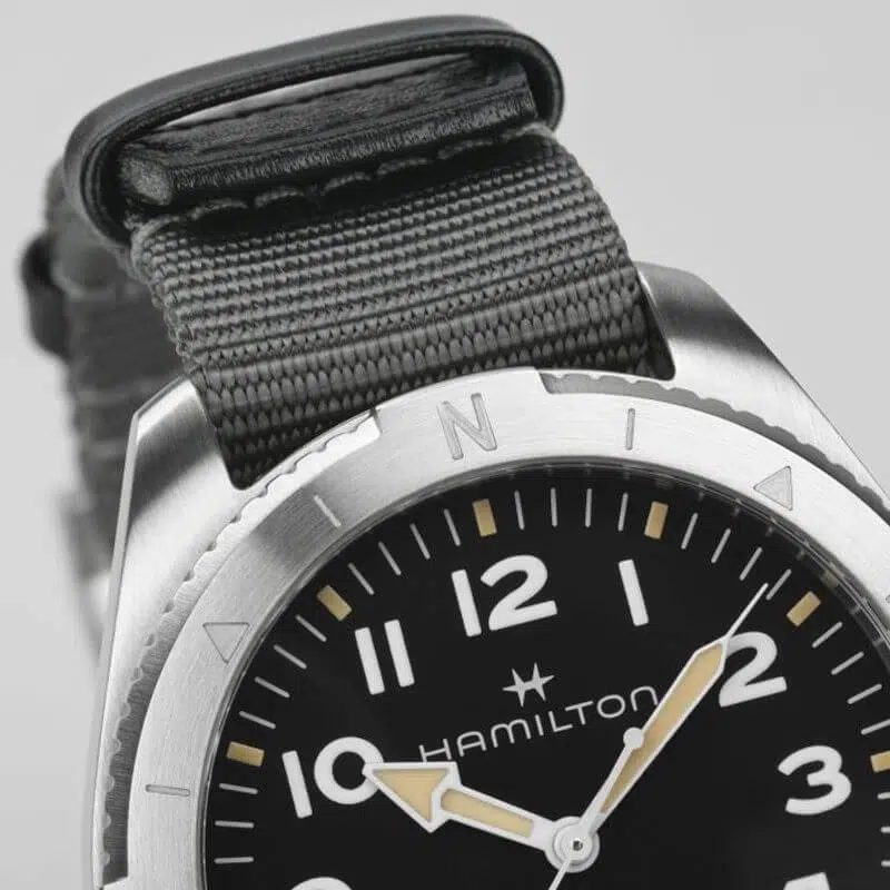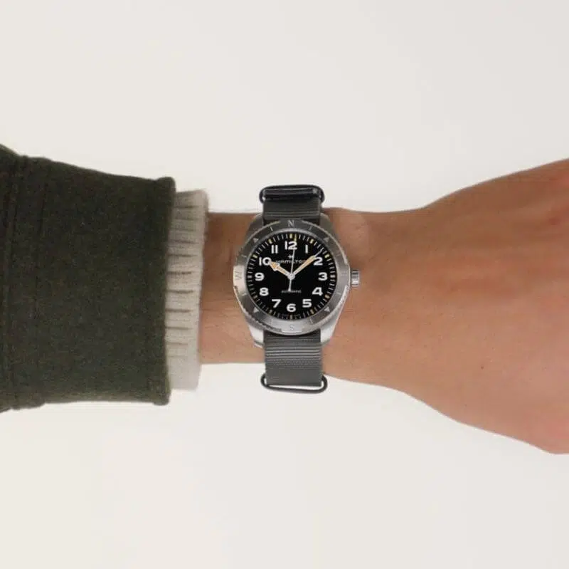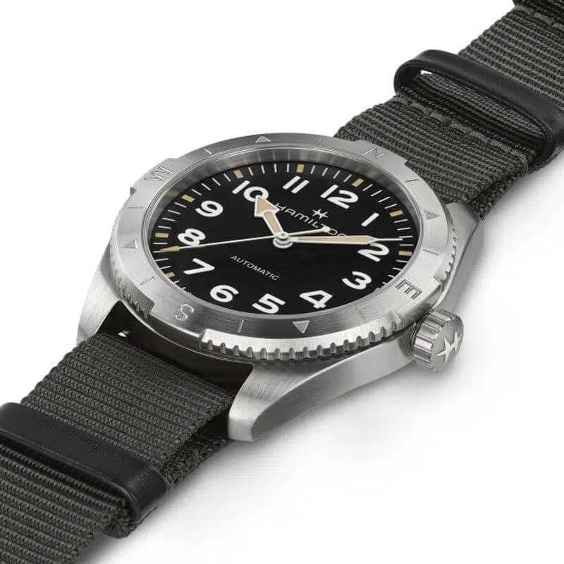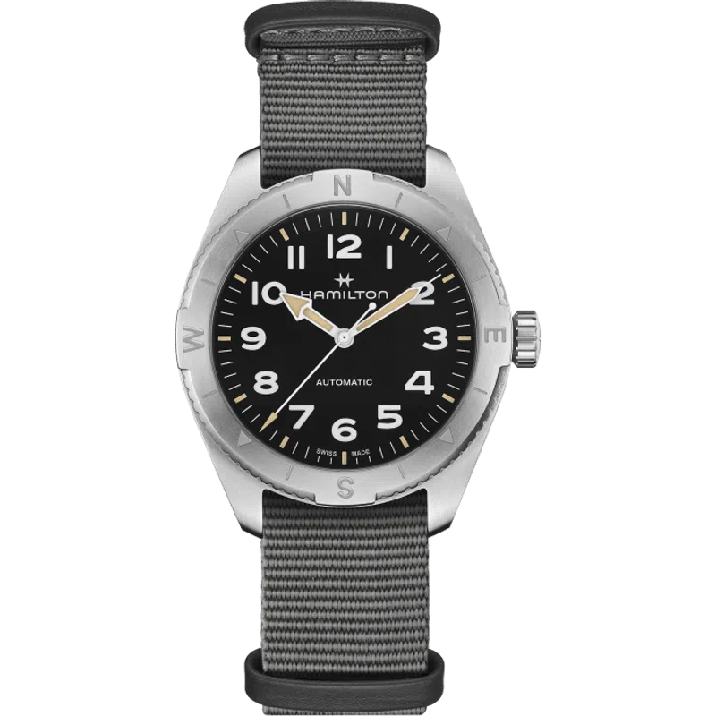 Prepararsi per le avventure all’aria aperta non è mai stato così facile grazie al Khaki Field Expedition e al suo nuovo cinturino NATO. Un orologio ideale per tutte le attività outdoor con un design a bussola, che ti permetterà, durante le escursioni, di orientarti con l’aiuto del sole. Racchiuso in una cassa in acciaio da 41 mm corredata da un cinturino NATO in tessuto grigio, il segnatempo è dotato di corona a vite e di un quadrante nero con finitura sabbiata, che lo rendono estremamente resistente.