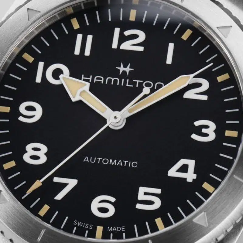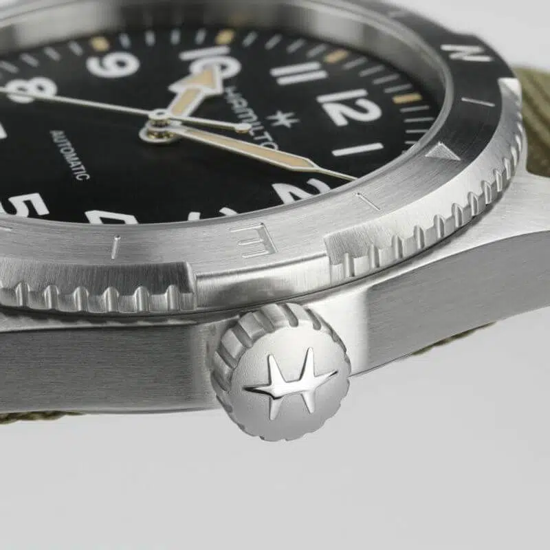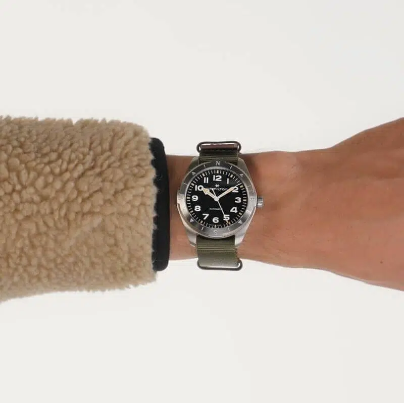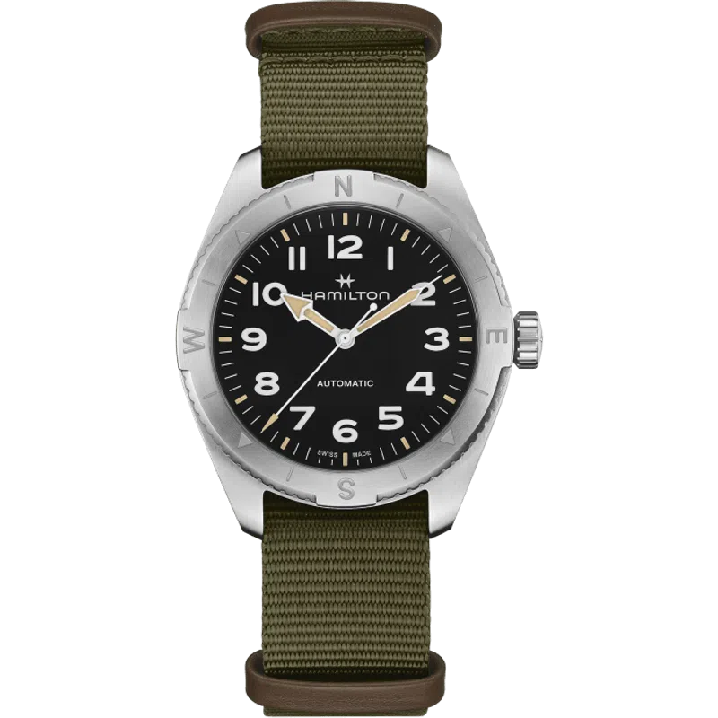 Prepararsi per le avventure all’aria aperta non è mai stato così facile grazie al Khaki Field Expedition e al suo nuovo cinturino NATO. Un orologio ideale per tutte le attività outdoor con un design a bussola, che ti permetterà, durante le escursioni, di orientarti con l’aiuto del sole. Racchiuso in una cassa in acciaio da 41 mm corredata da un cinturino NATO in tessuto verde, il segnatempo è dotato di corona a vite e di un quadrante nero con finitura sabbiata, che lo rendono estremamente resistente.