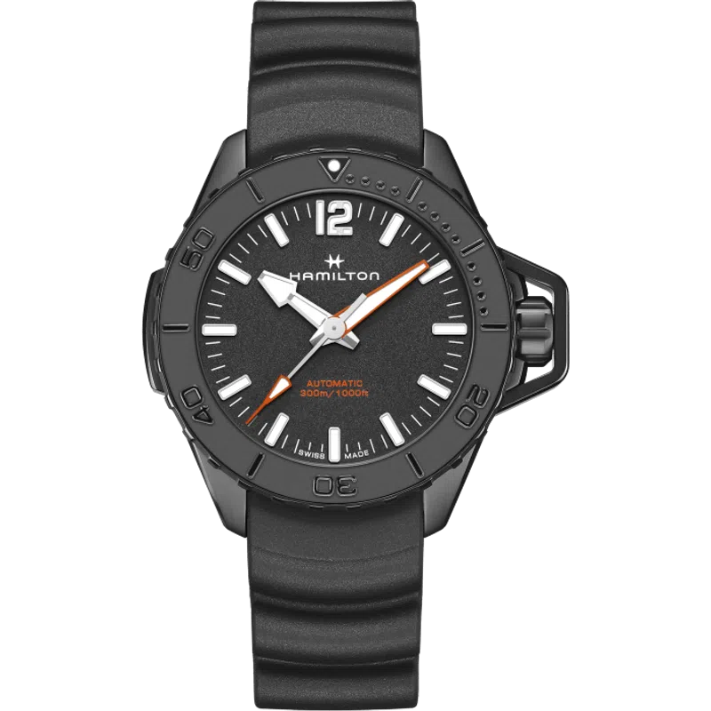 Con un nuovo look audace, il Khaki Navy Frogman Automatic è l’orologio Hamilton tecnicamente migliore per le avventure in mare. Progettato per garantire precisione, leggibilità e resistenza, porta l’insondabile potenza dell’oceano al polso. È inoltre dotato di una protezione della corona dalla forma unica, e di un cinturino in caucciù ondulato.