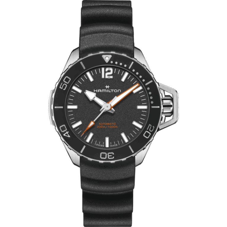 Il Khaki Navy Frogman Automatic si distingue per le prestazioni tecniche e l’iconico design. La sua cassa in acciaio da 41 mm è dotata di una corona a vite protetta da un robusto copricorona a forma di ponte per garantire l’impermeabilità fino a 30 bar (300 m), un omaggio al design del Frogman originale. Il Khaki Navy Frogman Automatic da 41 mm vanta un quadrante nero con strati di Super-LumiNova® per garantire una lettura precisa in qualsiasi circostanza e un cinturino in caucciù ondulato nero che ricorda il mare in movimento. Funzionale ed estremamente pratico, questo segnatempo è l’alleato perfetto per le tue avventure in mare e sulla terraferma.