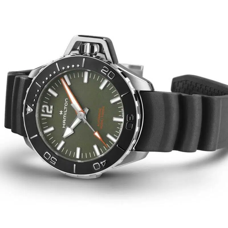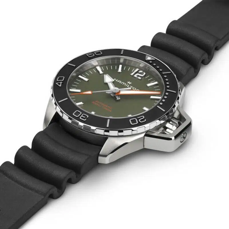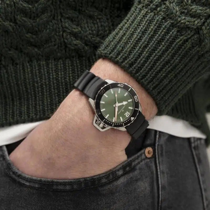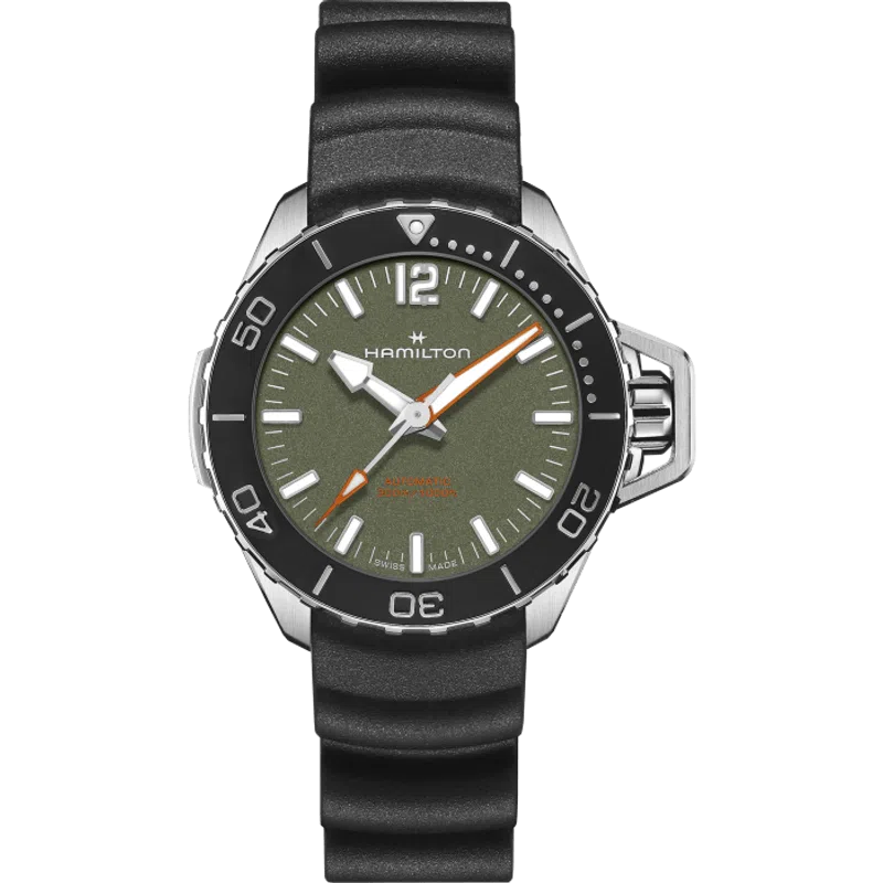 Il Khaki Navy Frogman Automatic si distingue per le prestazioni tecniche e l’iconico design. La sua cassa in acciaio da 41 mm è dotata di una corona a vite protetta da un robusto copricorona a forma di ponte per garantire l’impermeabilità fino a 30 bar (300 m), un omaggio al design del Frogman originale. Il Khaki Navy Frogman Automatic da 41 mm vanta un quadrante verde scuro con Super-LumiNova® applicato su indici e sfere per garantire una lettura precisa in qualsiasi circostanza e un cinturino in caucciù ondulato nero che ricorda il mare in movimento. Funzionale ed estremamente pratico, questo segnatempo è l’alleato perfetto per le tue avventure in mare e sulla terraferma.