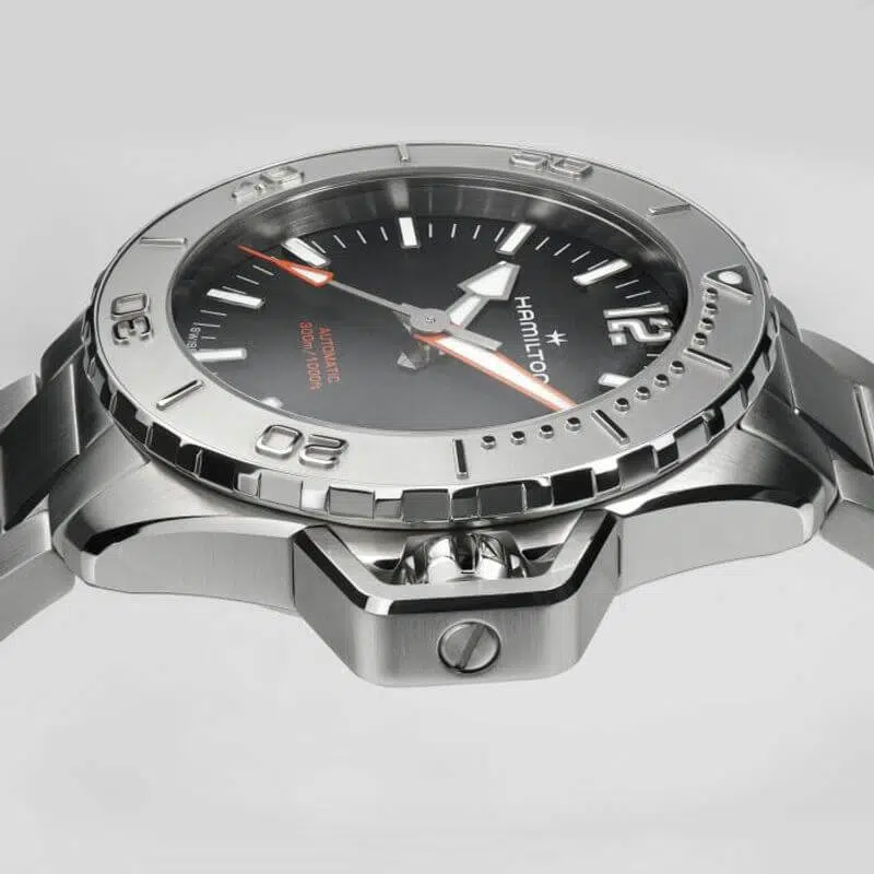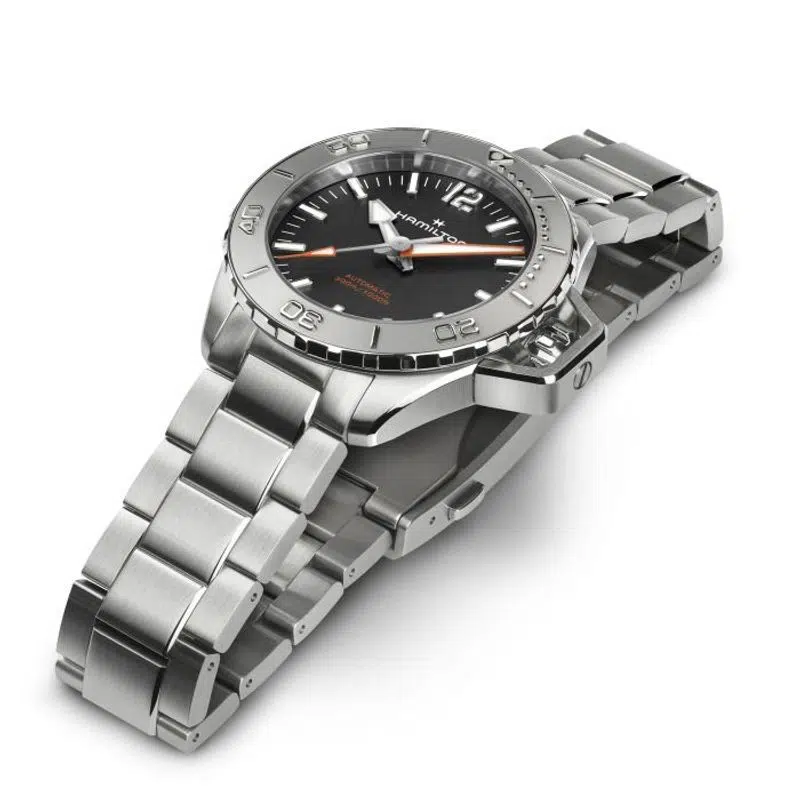 Il Khaki Navy Frogman Automatic si distingue per le prestazioni tecniche e l’iconico design. La sua cassa in acciaio da 41 mm è dotata di una corona a vite protetta da un robusto copricorona a forma di ponte per garantire l’impermeabilità fino a 30 bar (300 m), un omaggio al design del Frogman originale. Il Khaki Navy Frogman Automatic da 41 mm vanta un quadrante nero con Super-LumiNova® applicato su indici e sfere per garantire una lettura precisa in qualsiasi circostanza e un imponente bracciale in acciaio. Funzionale ed estremamente pratico, questo segnatempo è l’alleato perfetto per le tue avventure in mare e sulla terraferma.