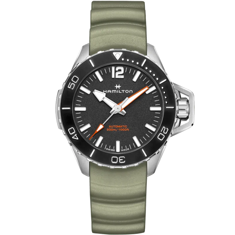 Con un nuovo look audace, il Khaki Navy Frogman Automatic è l’orologio Hamilton tecnicamente migliore per le avventure in mare. Progettato per garantire precisione, leggibilità e resistenza, porta l’insondabile potenza dell’oceano al polso. È inoltre dotato di una protezione della corona dalla forma unica, e di un cinturino in caucciù ondulato.