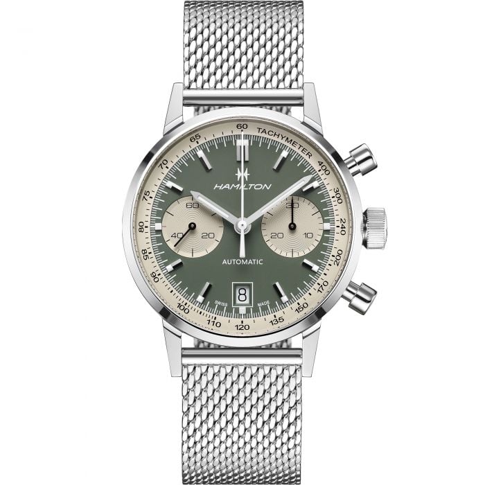 Il nuovo Hamilton Intra-Matic Automatic Chronograph è un connubio di sportività e vintage: uno stile che saprà catturare l’attenzione. Rivisitazione moderna di un pezzo iconico datato 1968, presenta il caratteristico quadrante effetto “panda” in un nuovo abbinamento bianco e verde chiaro. Che tu scelga la versione bracciale maglia milano o il cinturino in pelle marrone, il tuo stile sarà sempre inimitabile.