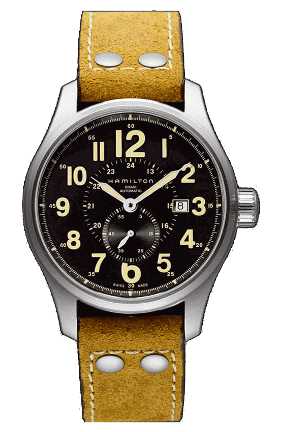 Il Khaki Officer Auto con il suo movimento automatico unisce la natura selvaggia della linea Khaki con la semplicità e la raffinatezza della linea Jazzmaster. I numeri di grandi dimensioni sul quadrante offrono una dichiarazione coraggiosa adatto per qualsiasi comandante