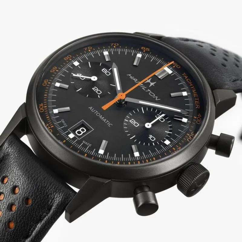 Ispirato alle sue radici negli sport automobilistici, che risalgono al 1968, l’Intra-Matic Auto Chrono accoglie una nuova interpretazione dell’iconico design Intra-Matic. Rivisitazione moderna di un classico vintage, la cassa da 40 mm con rivestimento in PVD, il quadrante e il cinturino traforato total black con accenti di arancione vivace aggiungono un tocco contemporaneo a un modello storico degli anni ‘70.