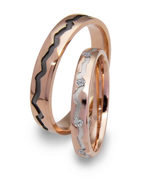 Fedi nuziali dalla forma contemporanea e un po’ inusuale. Sono caratterizzate da uno scavo irregolare, in rodio bianco o nero, che si pu� impreziosire con piccoli diamanti disposti lungo la circonferenza.