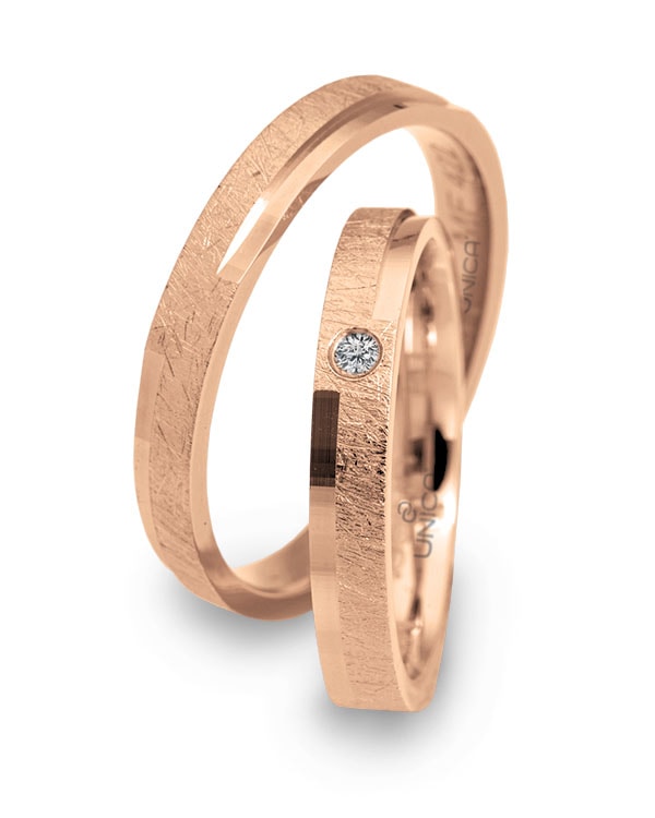 La forma piatta di queste fedi nuziali acquista dinamismo� grazie alla presenza di due scavi particolari: si alternano tra loro sviluppandosi solo su mezza circonferenza. Il contrasto � reso pi� evidente dalla superficie ghiaccio che si contrapposizione alle zone lucide degli scavi. Sull’anello da donna il punto di incontro � sottolineato dalla presenza di un diamante.