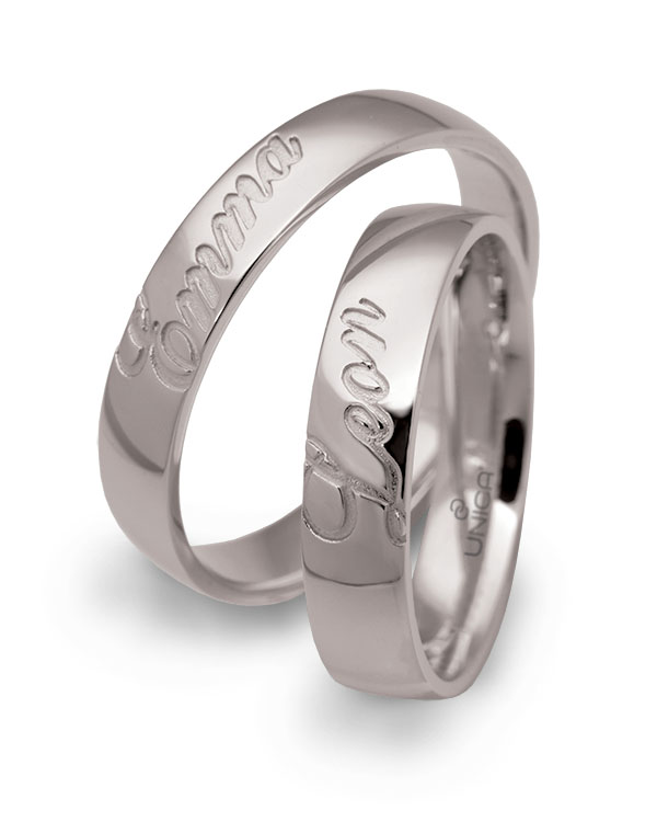 Anelli nuziali� dalla forma appena stondata, impreziositi dall�incisione esterna dei nomi degli sposi o di eventuali figli. L�incisione in corsivo � profonda e ben definita grazie anche alla finitura sabbiata in contrasto con la superficie lucida. Disponibile solo in monocolore.