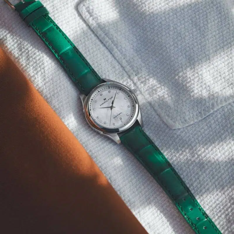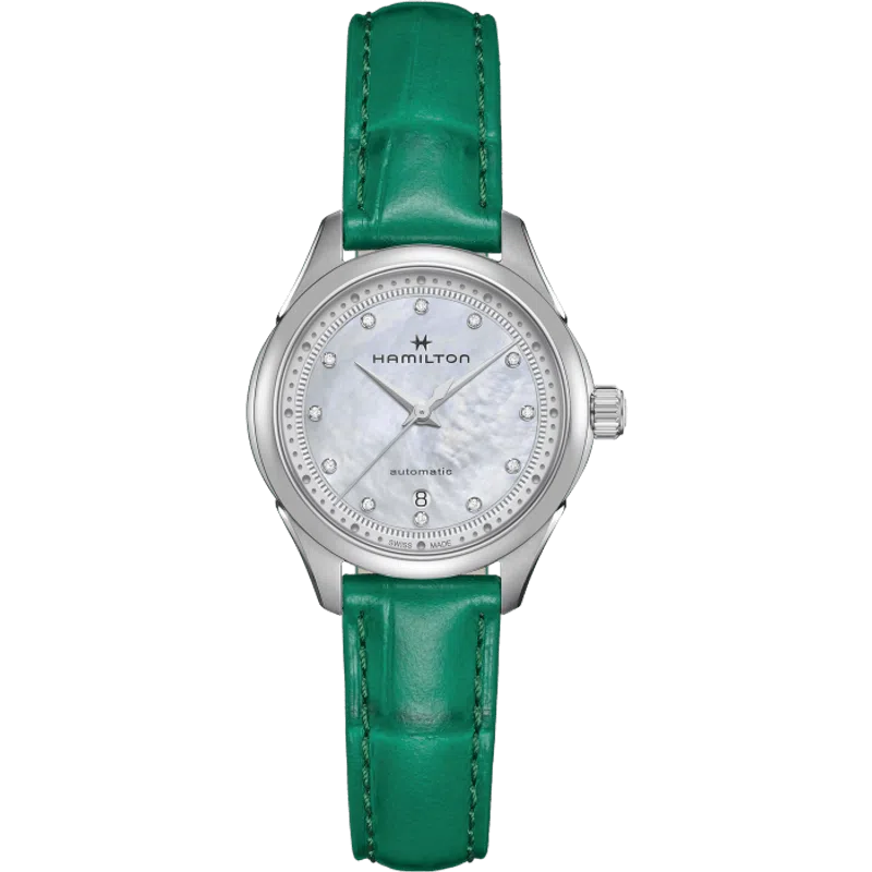 L’elegante cinturino in pelle verde con finitura in alligatore ed il quadrante in madreperla con indici in diamanti, sono gli elementi distintivi di questo Jazzmaster Lady Auto. Il movimento automatico con 44 ore di riserva di carica, racchiuso nella cassa da 30 mm, è sinonimo di precisione ed affidabilità.
