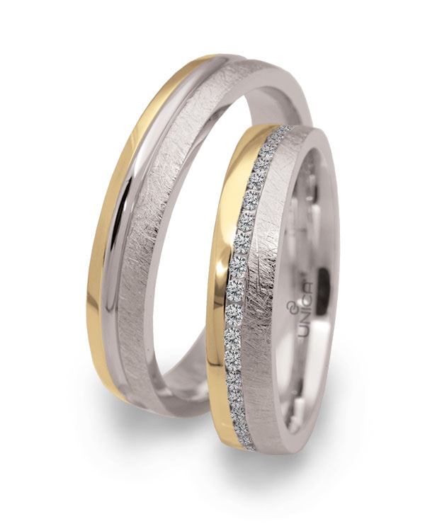 Il contrasto di colori e finiture dona freschezza a queste fedi dall’aspetto importante. Gli anelli hanno una forma esterna quasi piatta con interno leggermente comfort. Lo scavo attraversa in diagonale l’anello, con girodito di diamanti per lei e lucido per lui.
