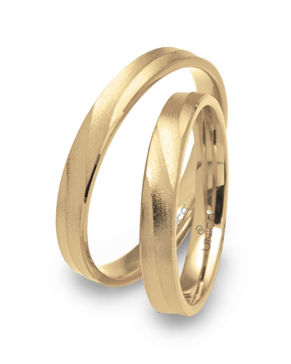 Sottili fedi nuziali dalla forma leggermente irregolare data dalla lavorazione esterna con finitura sabbiata. Disponibili solo in monocolore.