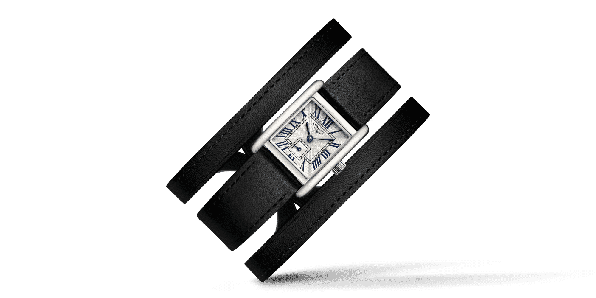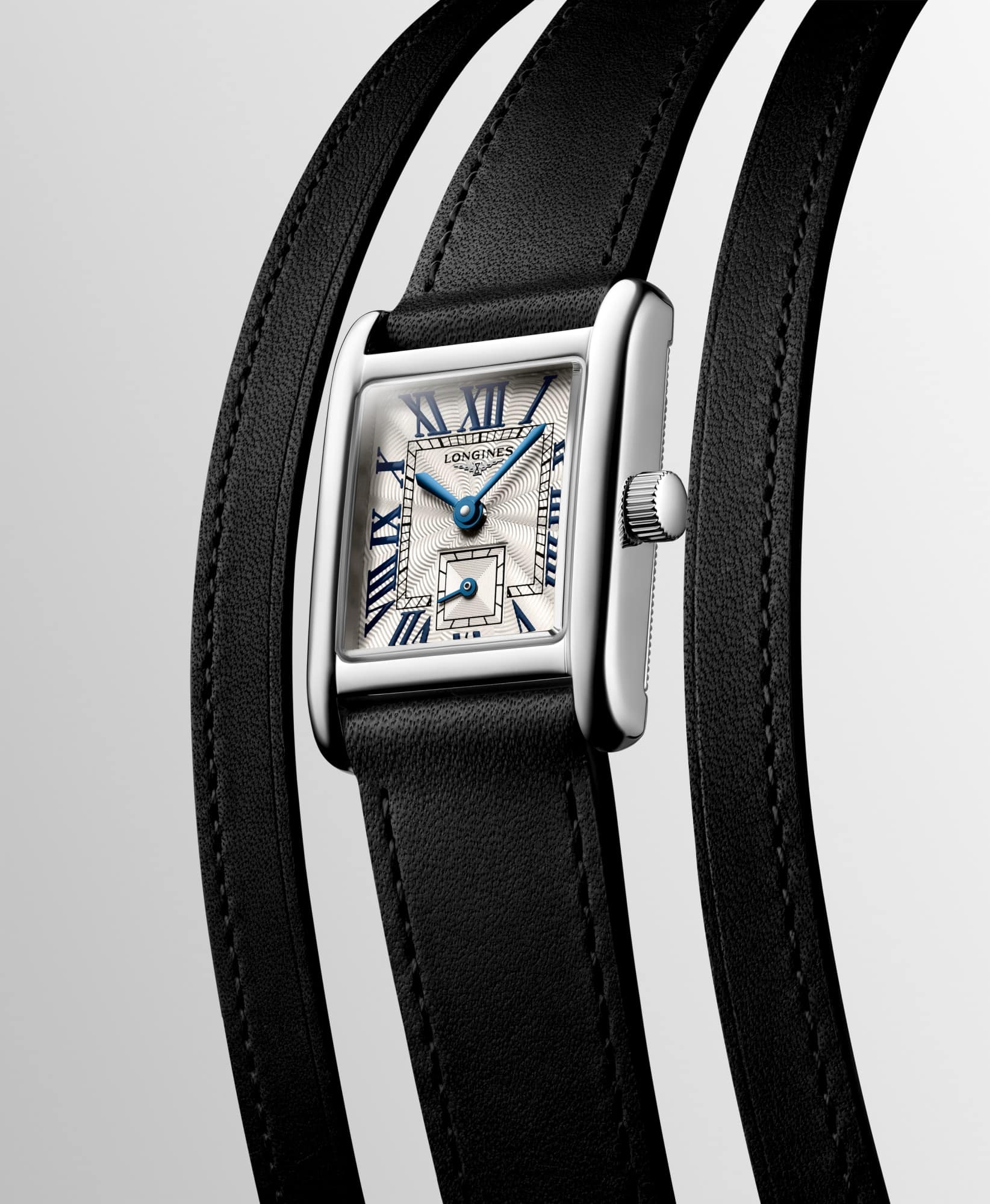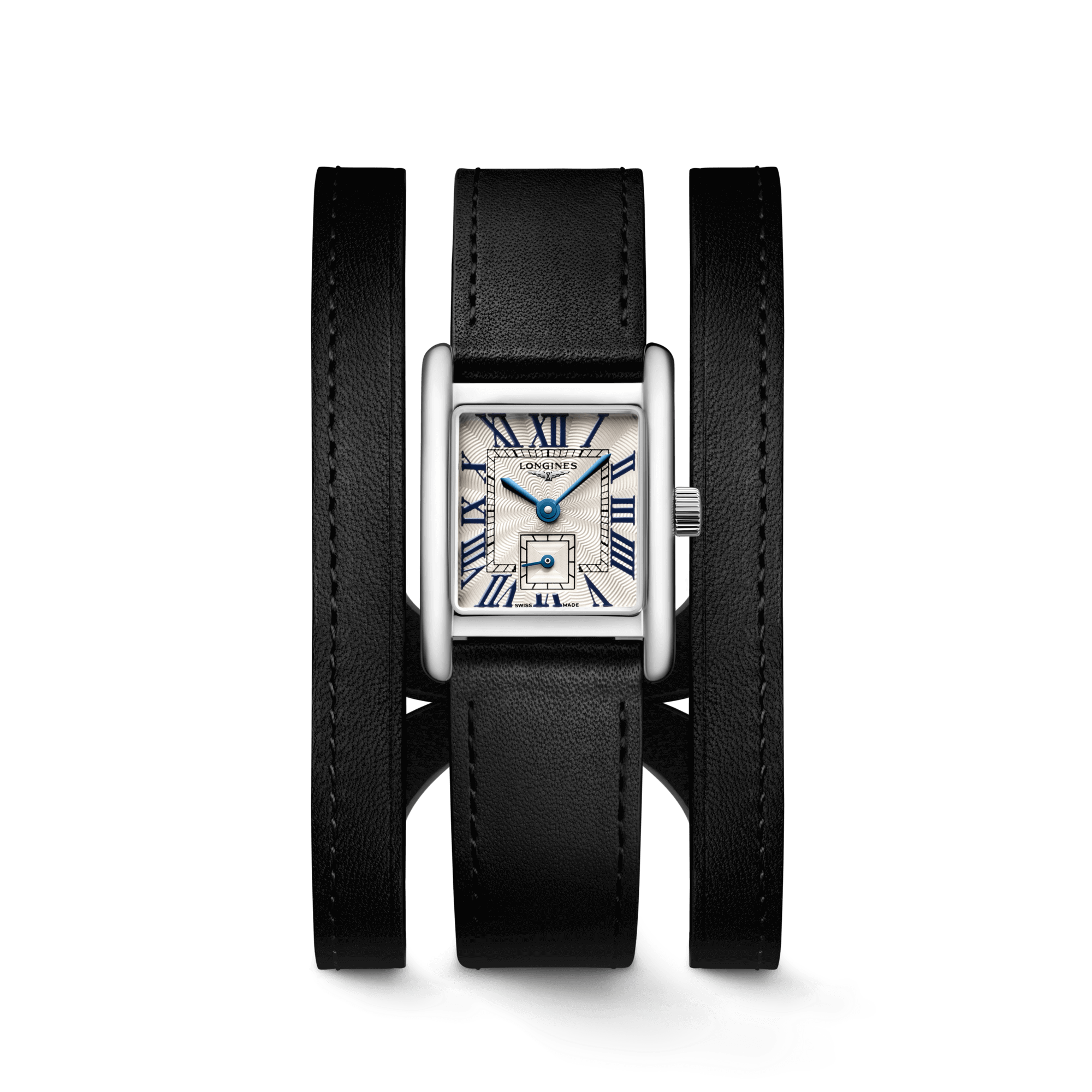 Il Mini DolceVita sfoggia nuovi cinturini in pelle, in perfetto stile esclusivo Longines.Questo modello è disponibile ora in versione nera con cassa rettangolare in acciaio inox da 21,50 mm x 29,00 mm, dotato di un movimento al quarzo di alta precisione L178 e impermeabile fino a 3 bar (30 metri). Il quadrante flinqué argentato è decorato con numeri romani dipinti e rifinito da un elegante cinturino doppio in nappa nera con fibbia ad ardiglione in acciaio.