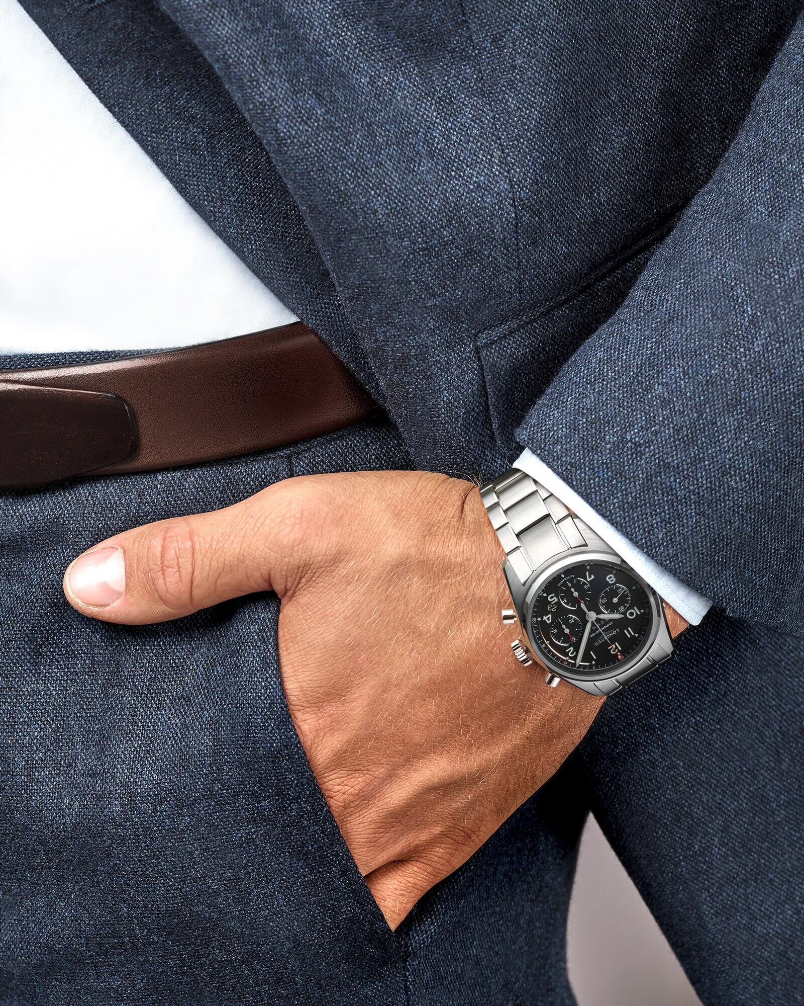 Funzioni cronografiche: Meccanismo del cronografo: lancetta centrale dei 60 secondi, contatore dei 30 minuti a ore 3 e contatore delle 12 ore a ore 6