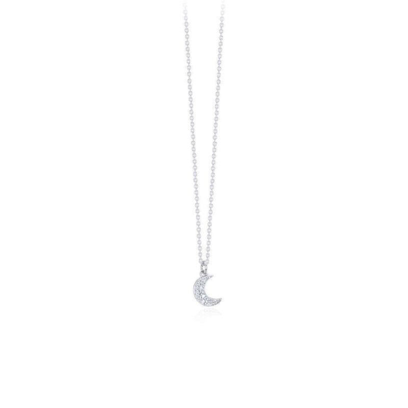 Collana in argento rodiato 925/1000 con pendente mezza luna, zirconi bianchi.