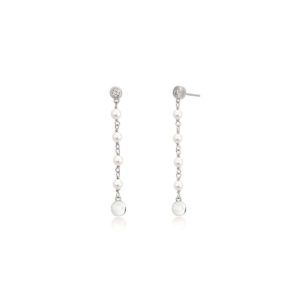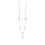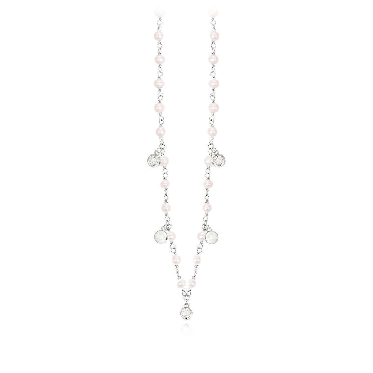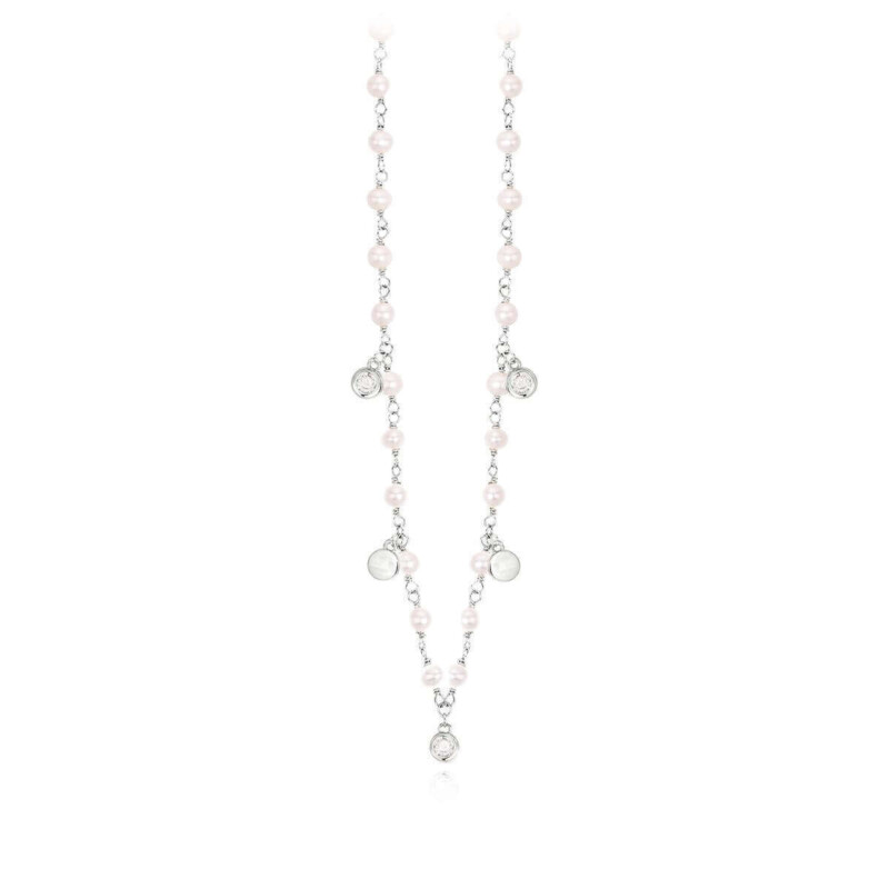 Collana in argento 925/1000 con perle coltivate 3,5 mm e zirconi. Lavorazione a rosario e lunghezza regolabile fino a 45 cm. Zirconi e piattine argento pendenti.