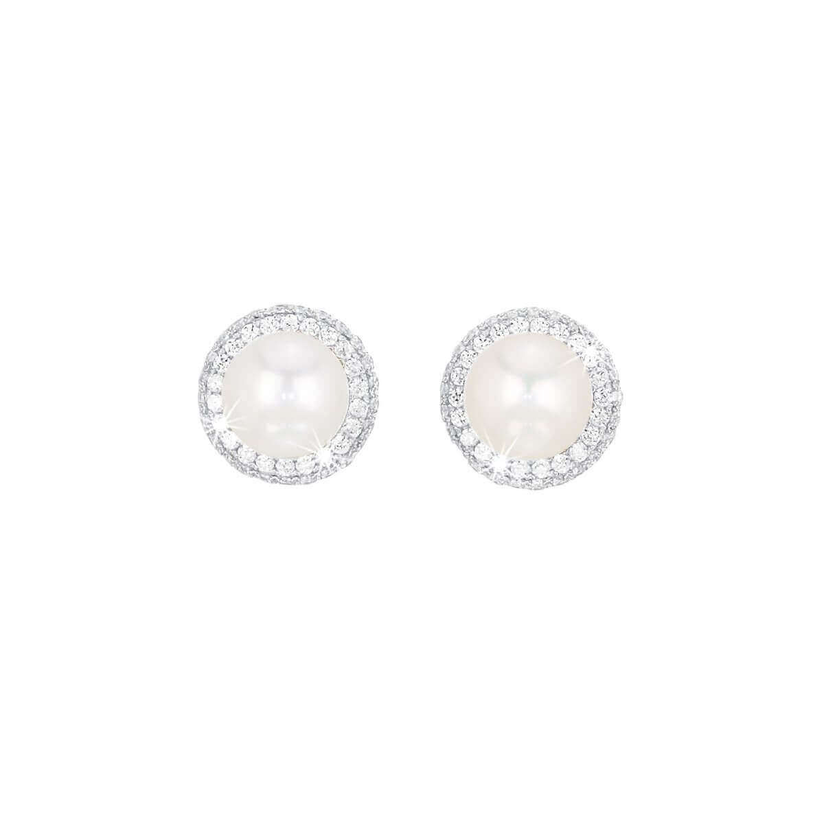 Eleganti orecchini a lobo in argento rodiato 925/1000 con zirconi bianchi e perla coltivata d'acqua dolce bianca mm. 7/7,5.