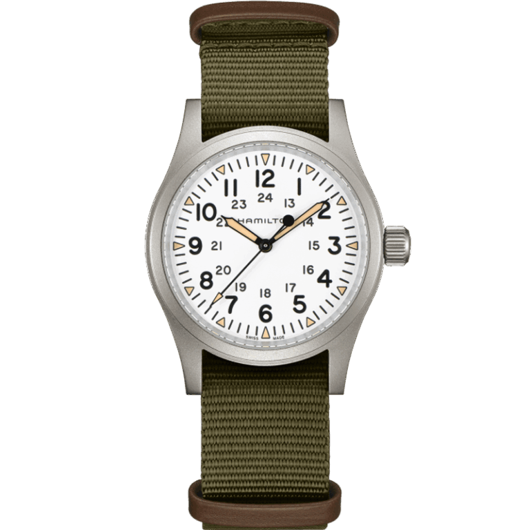 Cassa in acciaio opaco da 38 mm, tre lancette, quadrante bianco, indici triangolari con Super-LumiNova® di colore simile ai precedenti in radio, robusto cinturino NATO: il nuovo Khaki Field Mechanical è una riproduzione fedele del suo predecessore degli anni Sessanta e si inserisce alla perfezione nella tradizione militare di Hamilton. Costruito per durare, è l’orologio militare per eccellenza.Scopri la nostra collezione di estilo militar