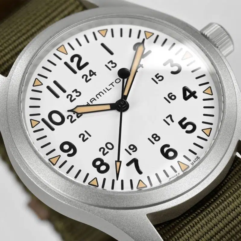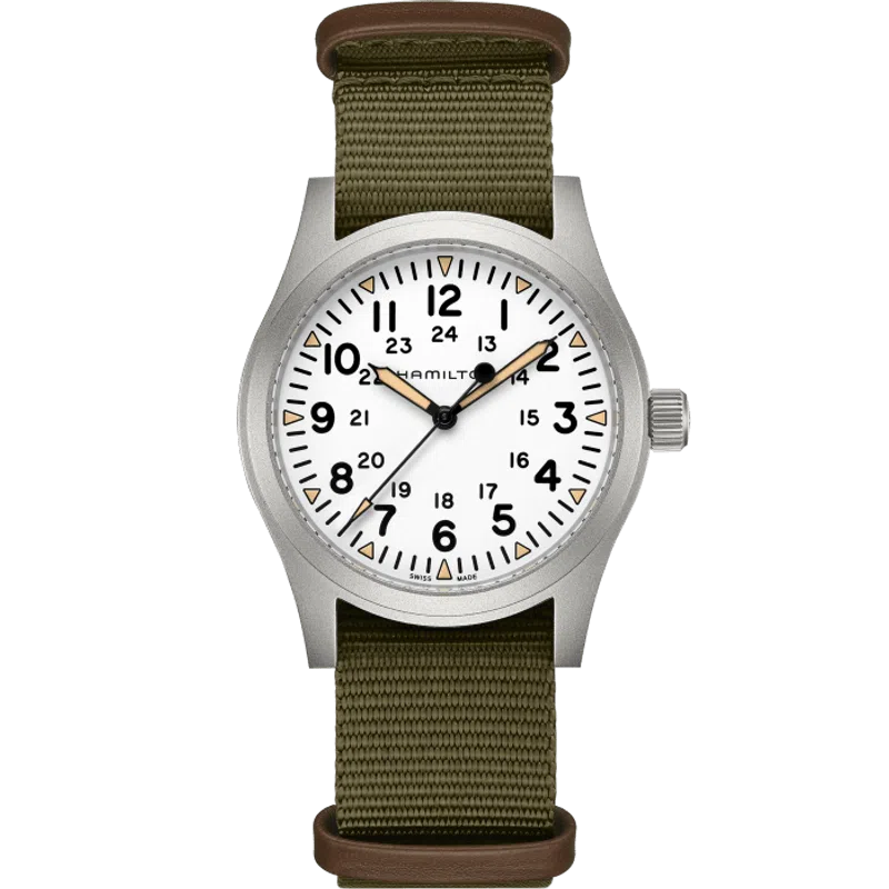 Uno dei segnatempo più iconici di Hamilton è ora disponibile con una cassa più grande. Animato dall’esclusivo movimento a carica manuale H-50, il Khaki Field Mechanical 42 mm conserva la forma originale con una cassa in acciaio con finitura sabbiata e quadrante facilmente leggibile in bianco o nero. Abbinata ad un comodo bracciale in acciaio o ad un cinturino NATO in tessuto verde, questa versione rivisitata di un orologio militare dal design robusto e resistente non ti farà perdere nessuna avventura.Scopri la nostra collezione di estilo militar
