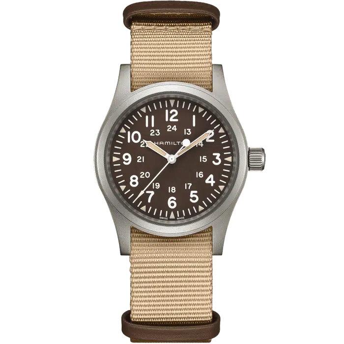 Cassa in acciaio opaco da 38 mm, tre lancette, quadrante scuro con luce, numeri luminescenti, indici delle ore e dei minuti, robusto cinturino NATO: il nuovo Khaki Field Mechanical è una riproduzione fedele del suo predecessore degli anni Sessanta e si inserisce alla perfezione nella tradizione militare di Hamilton. Costruito per durare, è l’orologio militare per eccellenza.