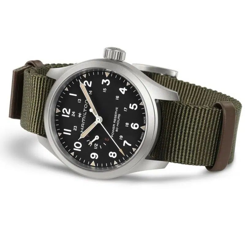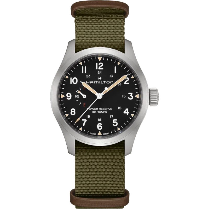 Il Khaki Field Mechanical Power Reserve 40 mm rende omaggio al design tradizionale e alla funzionalità essenziale della famiglia Khaki, introducendo al contempo caratteristiche moderne e le ultime novità in fatto di tecnologia e innovazione orologiere. Dotato di un nuovo movimento a carica manuale H-23, sviluppato da ETA in esclusiva per Hamilton, consente per la prima volta di visualizzare direttamente sul quadrante la riserva di carica di 80 ore. Abbinato a un robusto cinturino NATO verde khaki, il quadrante nero mostra le diciture “power reserve 80 hours” (“riserva di carica di 80 ore”), “F” (completamente carico) ed “E” (scarico), sottolineando questa caratteristica funzionale d’eccezione.