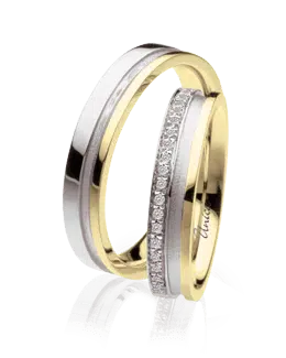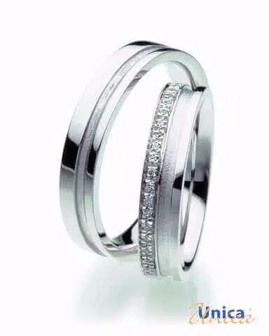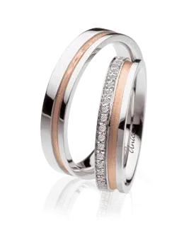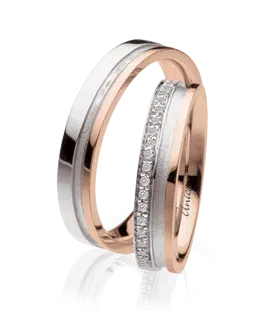 Una coppia di anelli molto elegante impreziosita, al femmilile, da un girodito di piccoli diamanti bianchi.