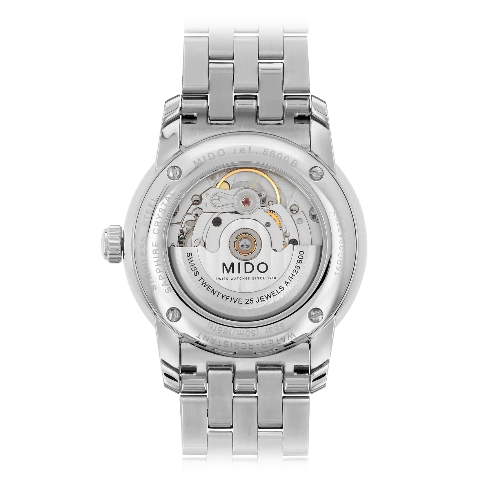 Il fondello trasparente di quest’orologio rivela un movimento automatico o meccanico finemente decorato, rinomato per la sua eccellenza. Ogni dettaglio del meccanismo è visibile, mostrando i materiali di alta qualità e il know-how orologiero di MIDO.