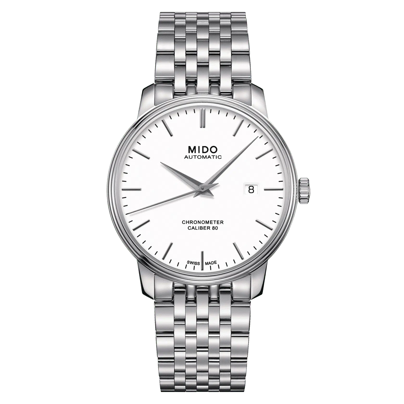 Il movimento MIDO Caliber 80 con cronometro di ultima generazione è dotato di una spirale in silicio. Oltre alle proprietà non amagnetiche, offre una maggior precisione e una resistenza agli urti maggiori. Assicura fino a 80 ore di autonomia.