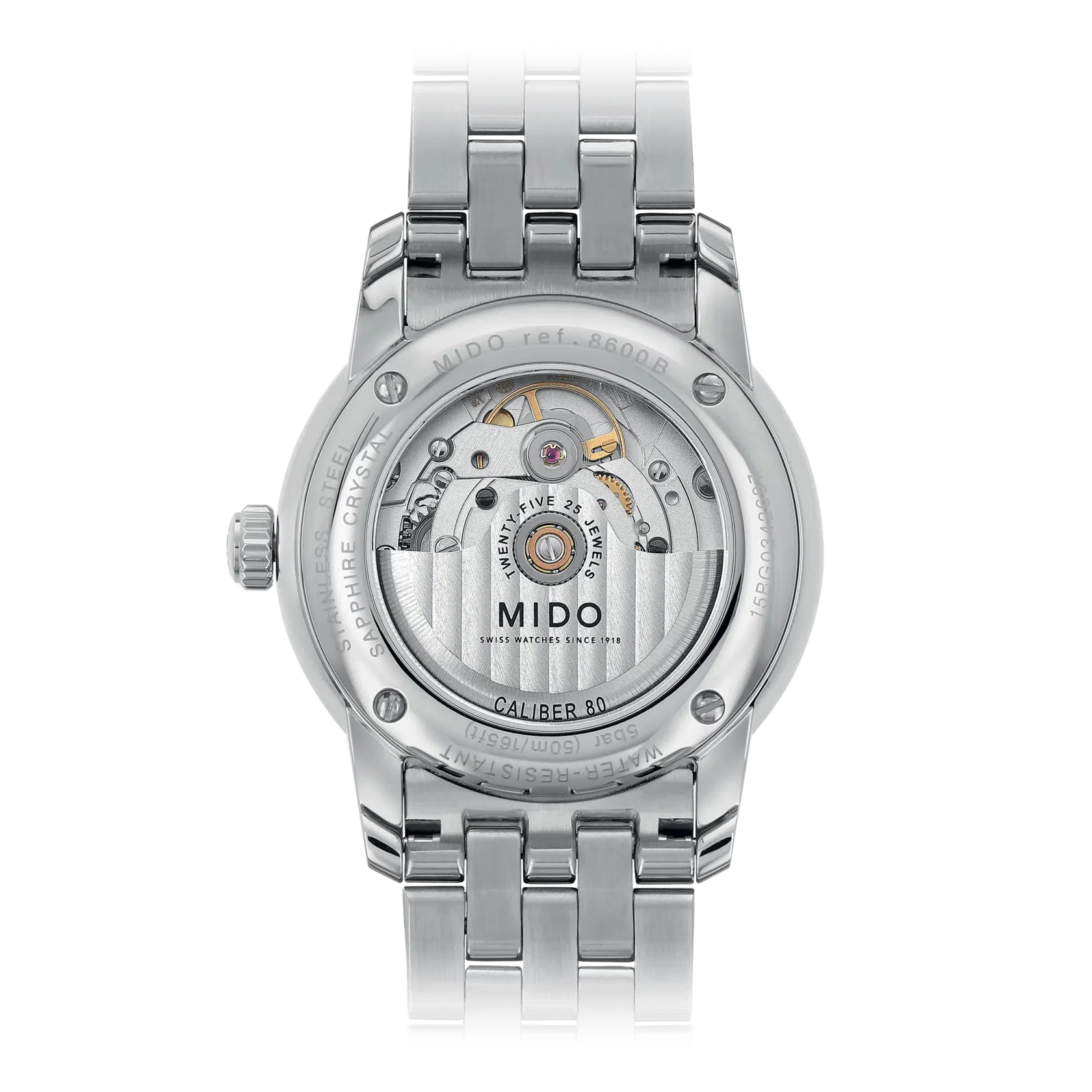 Il fondello trasparente di quest’orologio rivela un movimento automatico o meccanico finemente decorato, rinomato per la sua eccellenza. Ogni dettaglio del meccanismo è visibile, mostrando i materiali di alta qualità e il know-how orologiero di MIDO.