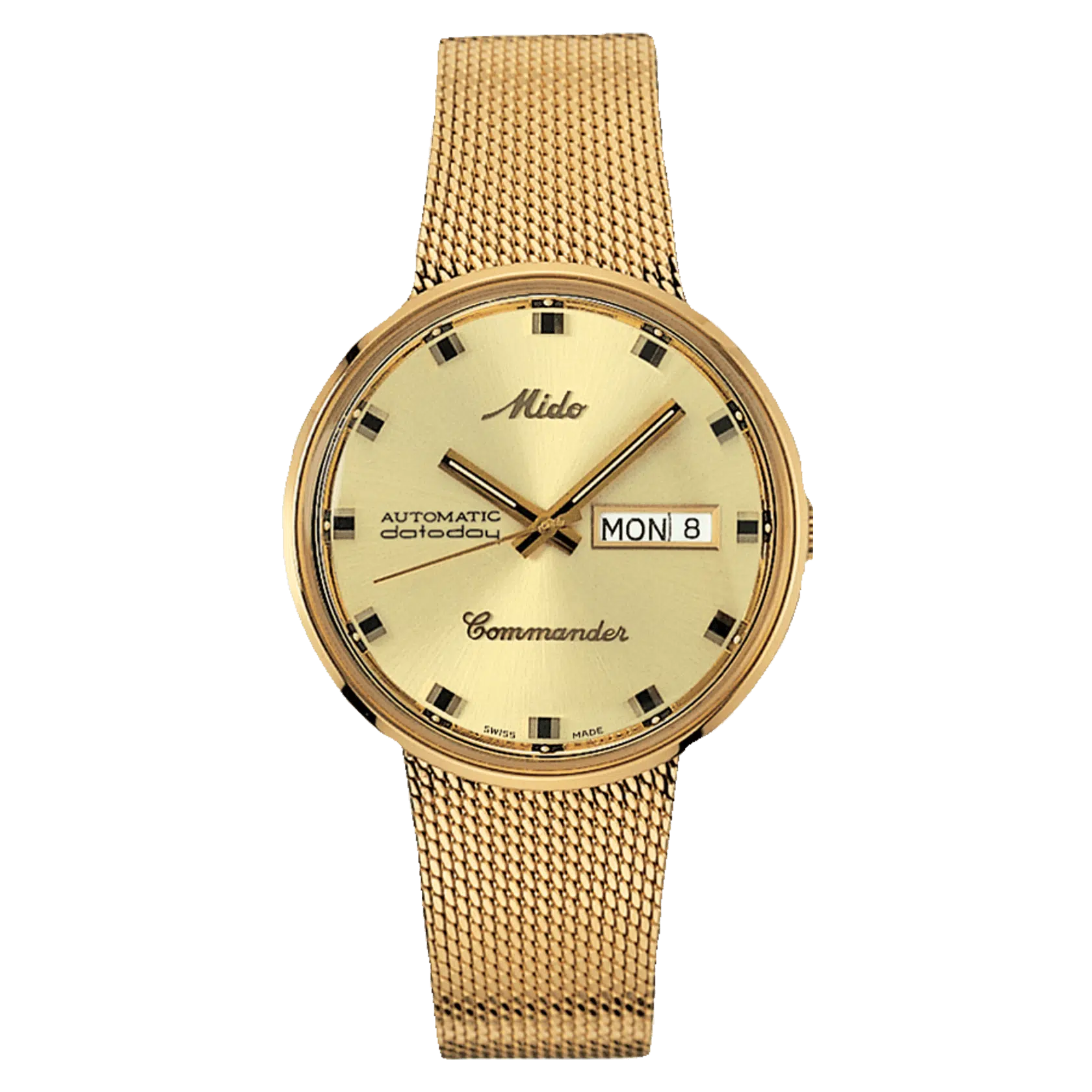 La collezione di orologi Commander 1959 viene prodotta senza interruzioni da quell’anno. Il bracciale integrato e il logo vintage di Mido sono tipici di questo modello iconico, così come la cassa monoscocca che racchiude un movimento automatico.