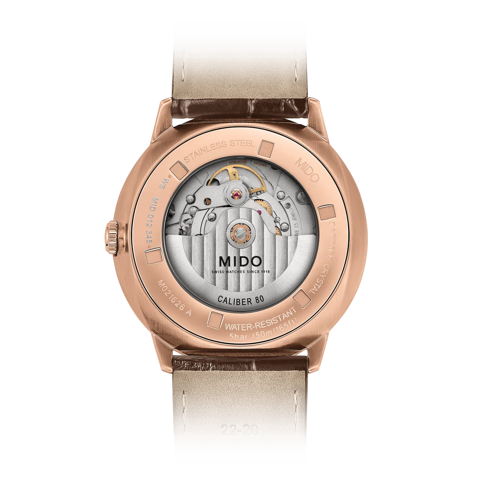 The MIDO Caliber 80 represents a major advance in self-winding movements. Thanks to its new-generation technology, it offers up to 80 hours of power reserve – twice as much as a conventional movement.