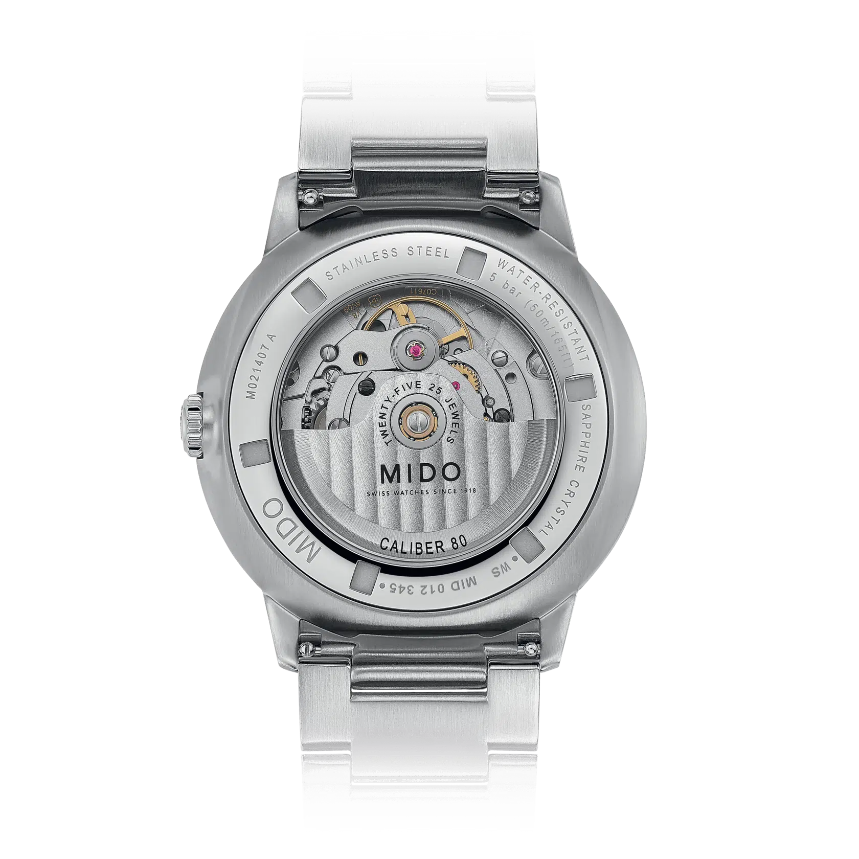 The MIDO Caliber 80 represents a major advance in self-winding movements. Thanks to its new-generation technology, it offers up to 80 hours of power reserve – twice as much as a conventional movement.