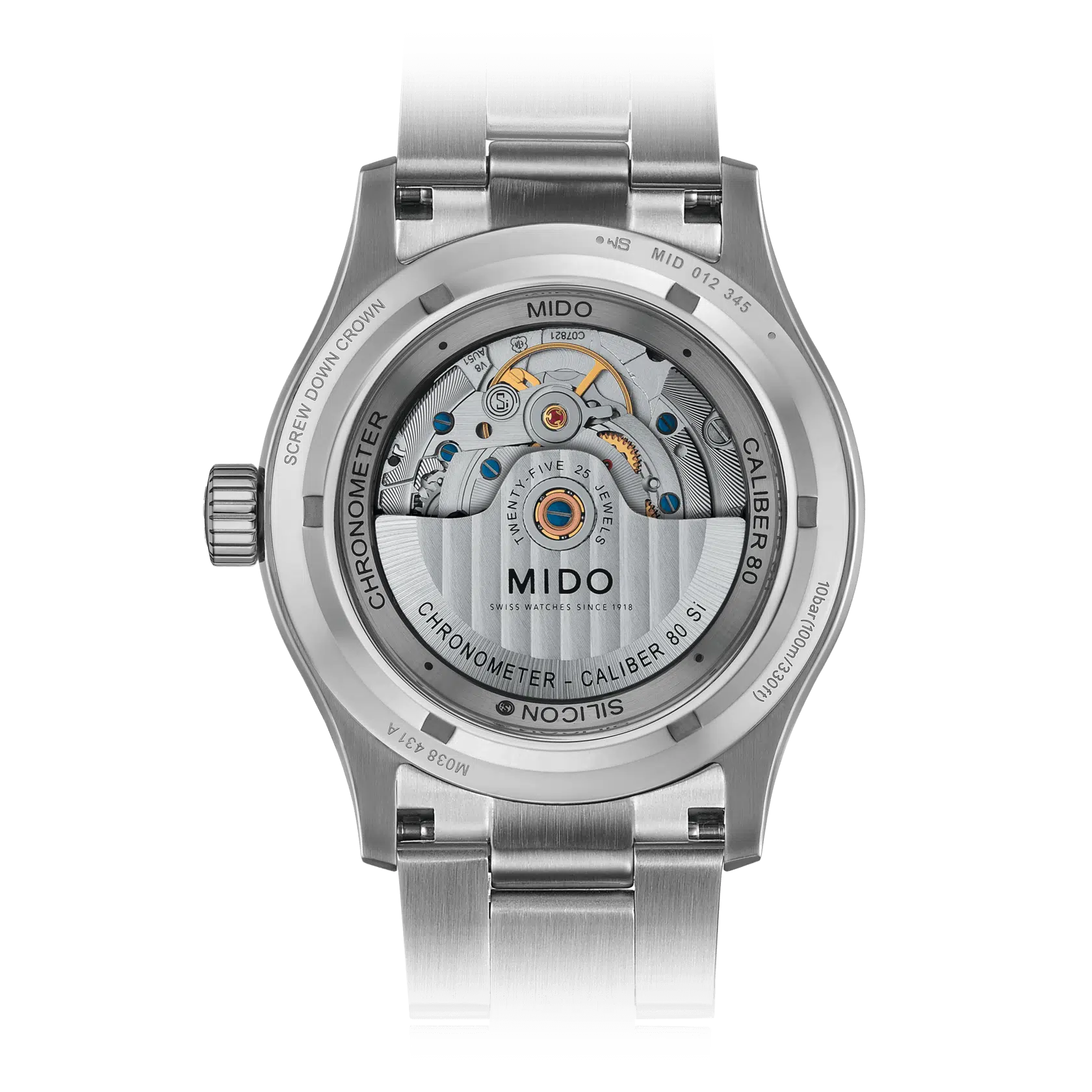 Il movimento MIDO Caliber 80 con cronometro di ultima generazione è dotato di una spirale in silicio. Oltre alle proprietà non amagnetiche, offre una maggior precisione e una resistenza agli urti maggiori. Assicura fino a 80 ore di autonomia.