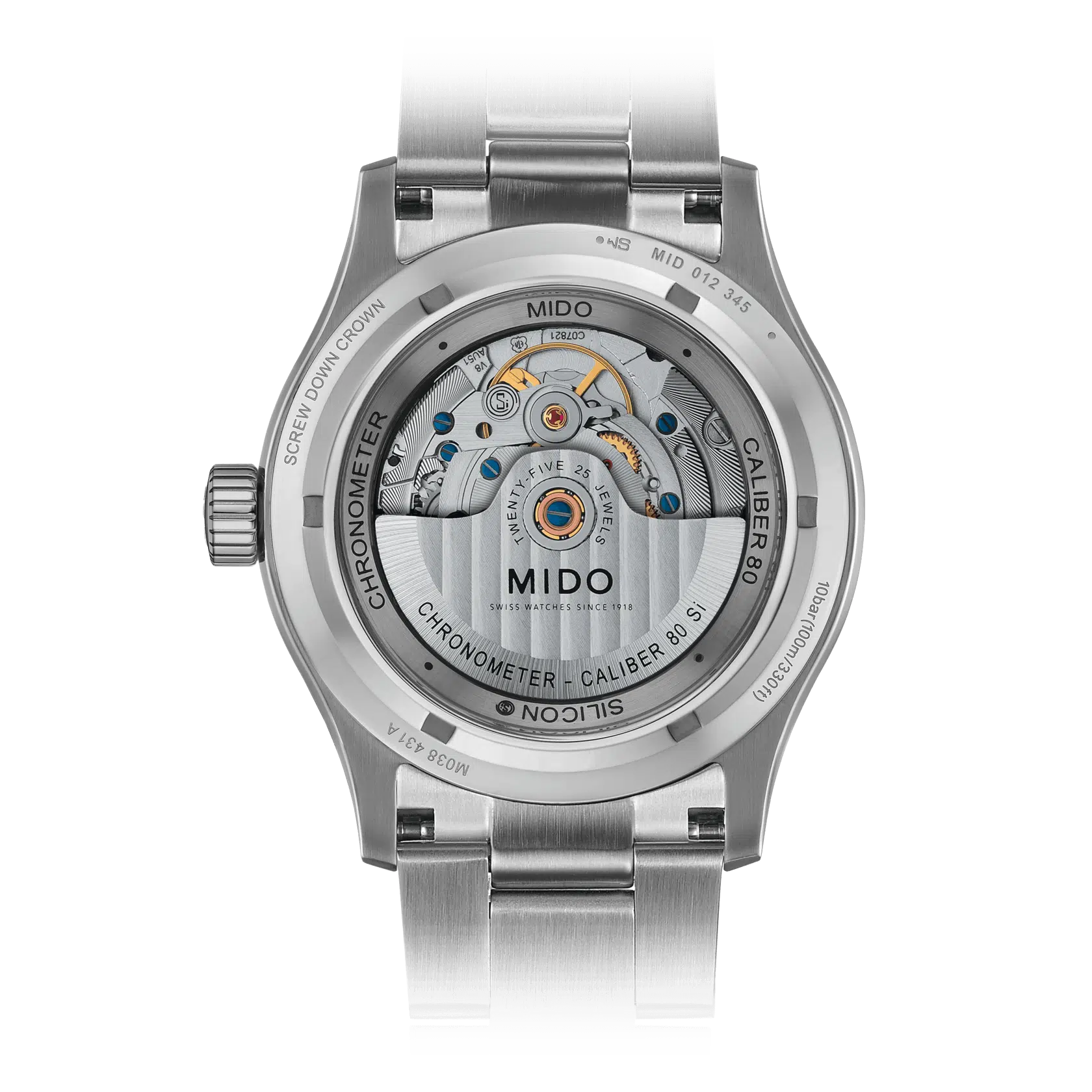 Il movimento MIDO Caliber 80 con cronometro di ultima generazione è dotato di una spirale in silicio. Oltre alle proprietà non amagnetiche, offre una maggior precisione e una resistenza agli urti maggiori. Assicura fino a 80 ore di autonomia.